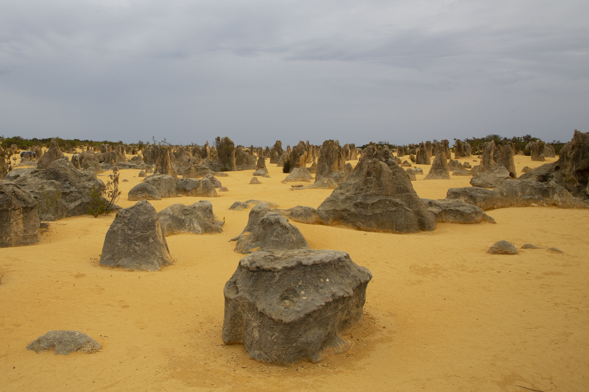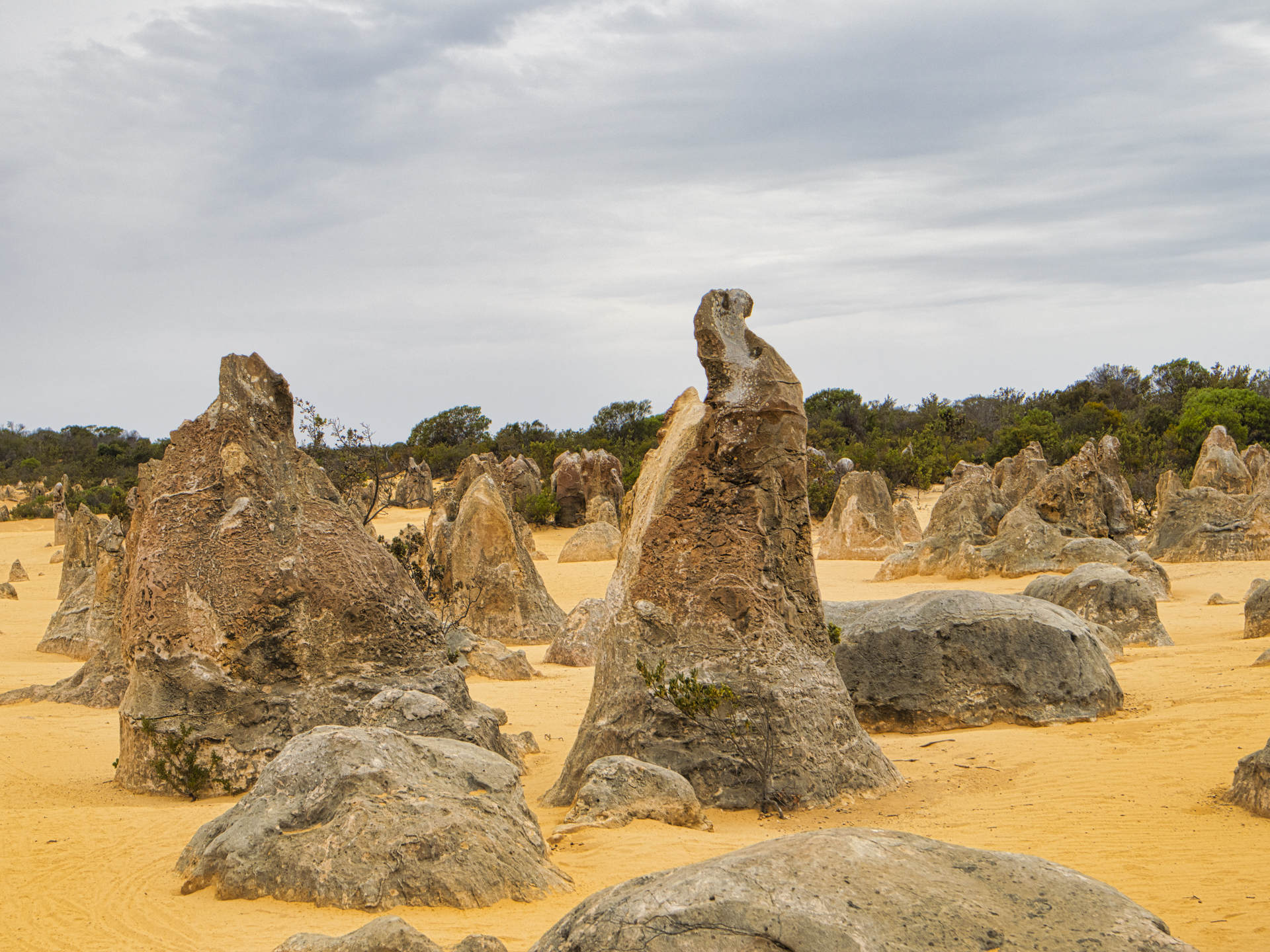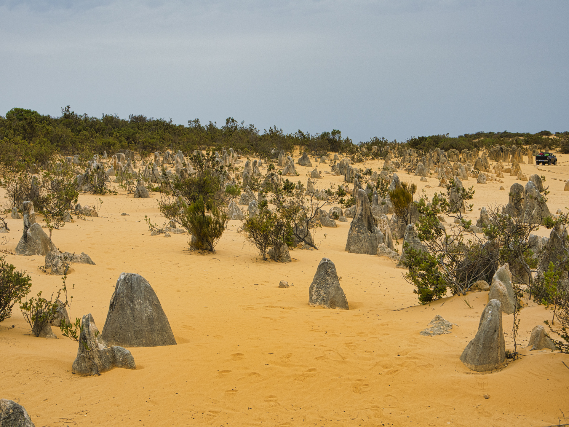Während außen herum das Buschland vorherrscht, besteht der Untergrund, auf dem die Pinnacles stehen, aus einem gelblichen, etwa ins Orange-Rot gehenden Sand. Der ist nur stellenweise fein, vielfach aber wie festgebacken. Und darauf erheben sich eben die Pinnacles. Man spekuliert, dass es sich um die Überreste eines Tuart-Waldes handelt. Wobei unklar ist, welche biologisch-chemischen Prozesse zu der Struktur geführt haben. Die These wird gestützt durch eine Oberflächentextur, die man bei vielen der Gebilde sieht, die sicherlich wir Zweige aussehen. Der äußere Farbton ist nicht einheitlich. Teilweise eher grau, wenn sich an der Oberfläche entsprechend Flechten o.ä. abgesetzt haben. Vielfach ein Farbton ähnlich dem Boden. Dann aber auch fast weiße Stellen, ähnlich dem Dünensand. Und dazwischen noch andere Farbschattierungen ins Rötliche. Die Oberflächenstruktur variiert ebenfalls stark. Zum Teil sah die Oberfläche aus wie Blätterteig, war aber richtig hart (wenn nicht, wären die filigranen Schichten sicherlich in Kürze erodiert).