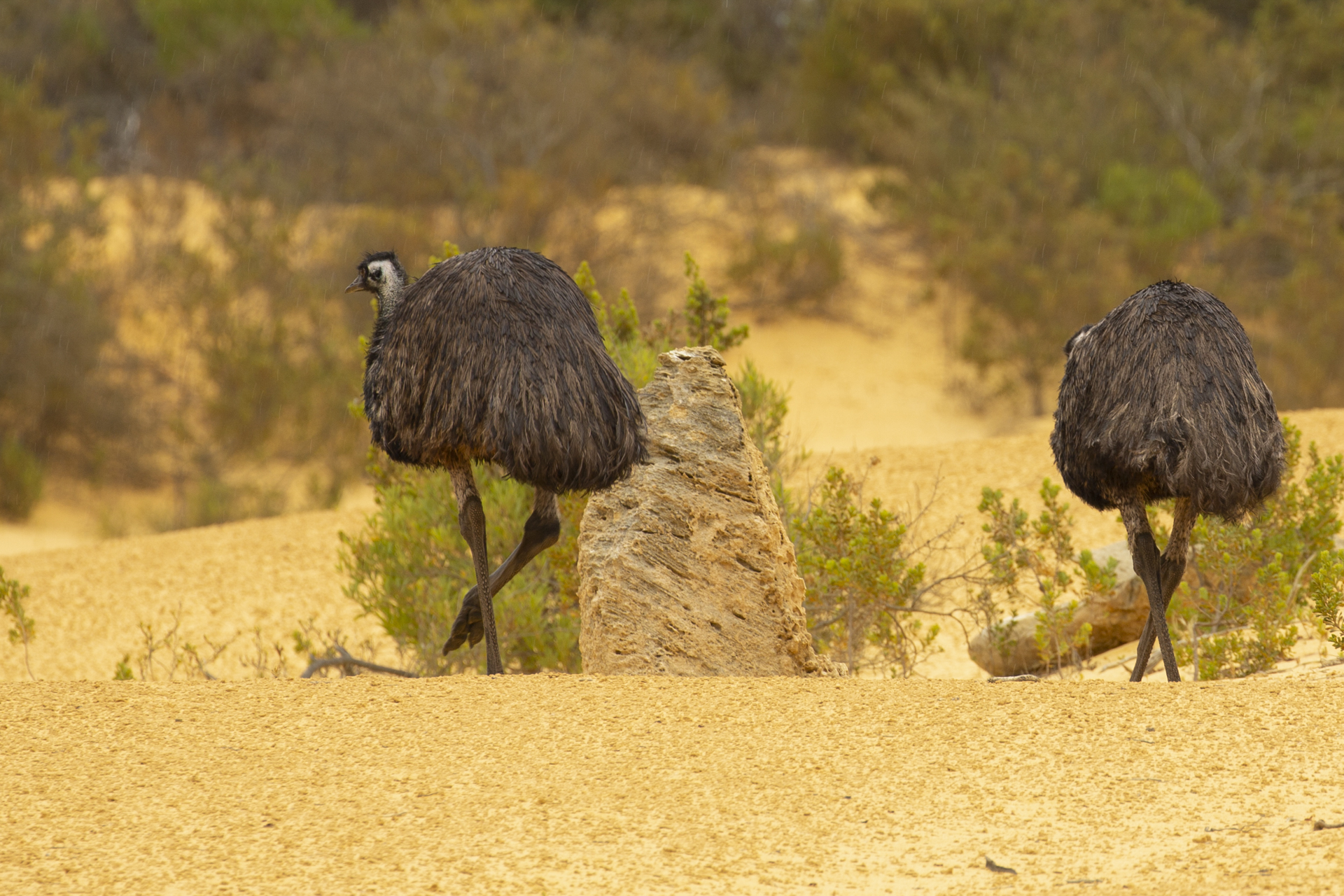 Auf dem Rückweg sahen wir schließlich noch zwei Emus, die sich erst mal nicht stören ließen. Auch nicht von den Touristen, die mit dem Auto durch das Gelände fuhren. Erst als eine andere Touristin meinte, mit ihrem Smartphone näher an die Tiere heranrücken zu müssen, wurde es den beiden Emus zu bunt und sie machten sich von der Bühne. Da ich zu lange gebraucht hatte, um mein Teleobjektiv zum Einsatz zu bringen, gelang mir lediglich noch ein Nachschuss.