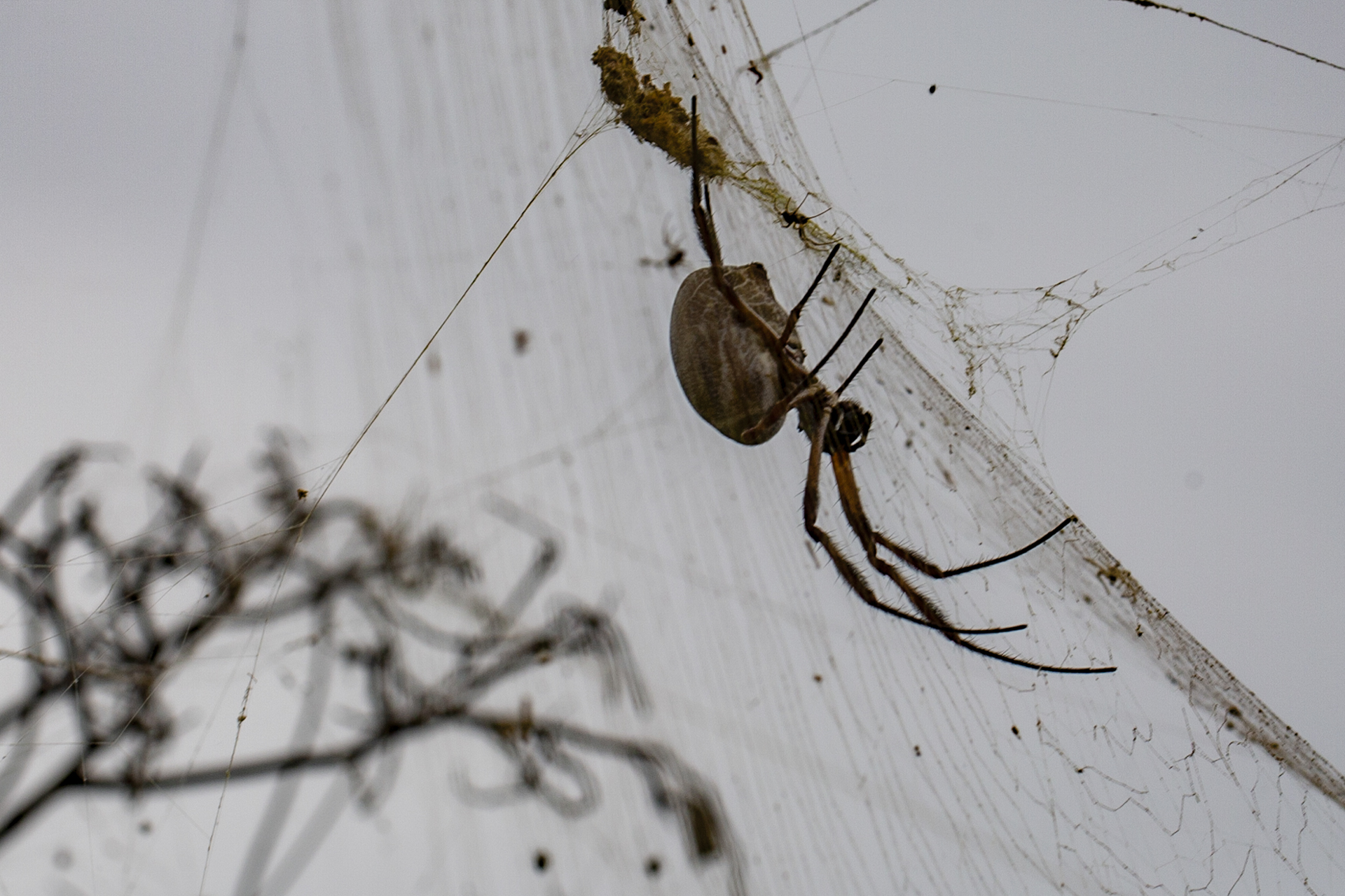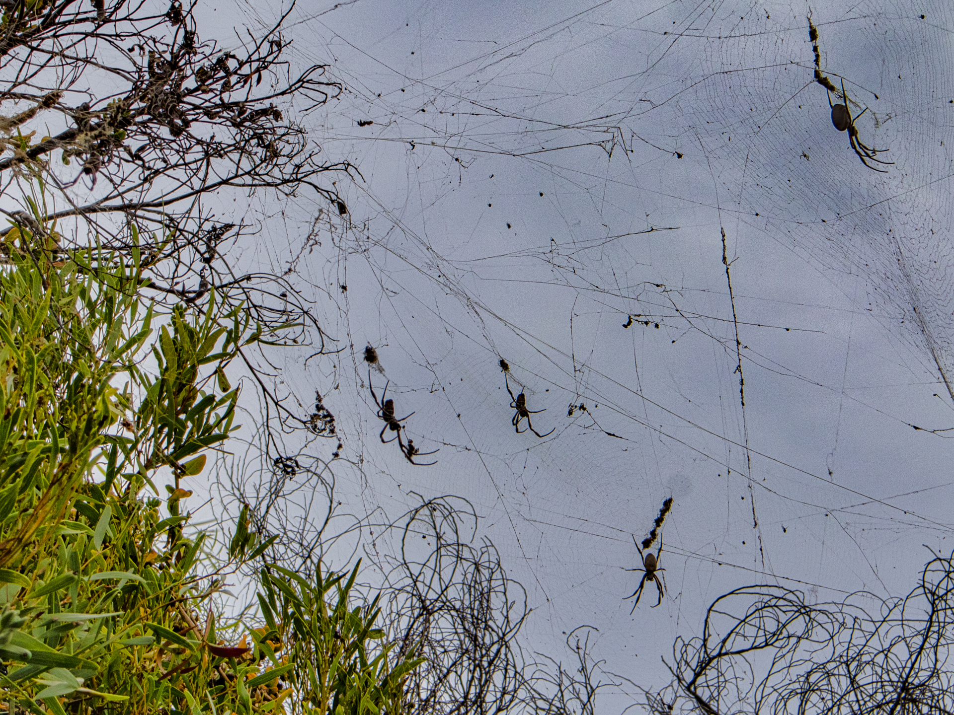 Nach ein paar Minuten Fahrt kamen wir zu einem Picknickbereich direkt hinter der Stranddüne und die Lunchboxen wurden verteilt. Nachdem wir unseren Salat mit Hähnchenbrustfilet verspeist hatten (die Törtchen ließen fast alle liegen), gingen die meisten zur Fußwaschung an den Strand. Ich versuchte zunächst einmal die großen Spinnen zu fotografieren, die in ihren Rädern direkt im Gebüsch hinter unserem Picknickplatz hingen. Wie üblich ist das ziemlich schwierig, die schwarzen Spinnen vor dem hellen Himmel vernünftig ins Bild zu bekommen.