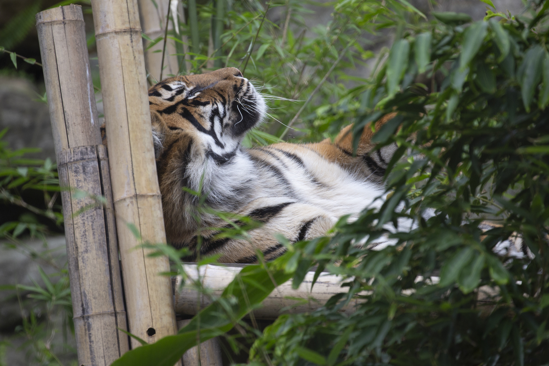 Eine der größten Attraktionen des Zoos ist der Tiger Track. Der Zoo unterstützt die Erhaltung der vom Aussterben bedrohten Sumatra-Tiger. Nun hatte das Weibchen im Februar drei Junge geboren und eigentlich sollten diese im Verlauf der Woche auch öffentlich gezeigt werden. Leider war es aber noch nicht so weit. Der Tiger Track selbst ist ganz witzig angelegt. Gruppenweise betritt man zunächst scheinbar den Rumpf einen Frachtflugzeugs und "fliegt", begleitet von Erklärungen, nach Sumatra. Dort steigt man aus dem Flugzeug und befindet sich in einem Dorf in Indonesien. Von da aus geht es einen Pfad entlang des nachgebildeten Lebensraumes der Sumatra-Tiger. Leider war von der Tiger-Familie nur der Vater im Gehege und der lag träge auf einer Plattform etwas weiter oben, so dass man gerade seinen Kopf sehen konnte.