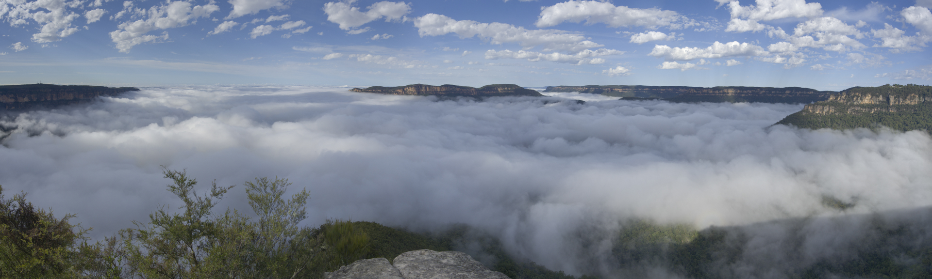 Bevor wir die Hauptattraktion der Gegend, die Scenic World anfuhren, machten wir noch einen Abstecher zum Sublime Point. Bereits beim Frühstück hatte wir gesehen, dass in den Tälern eine geschlossene Nebel- oder Wolkenschicht lag. Wir waren aber ein ganzen Stück darüber. Vom Sublime Point schweifte der Blick über die Weiten der Blue Mountains, wobei es aber so aussah, als würden Felseninseln aus einer weiß schäumenden See herausragen. Wir konnten uns fast nicht von dem phantastischen Naturschauspiel losreißen. Aber es lockte ja noch mehr.