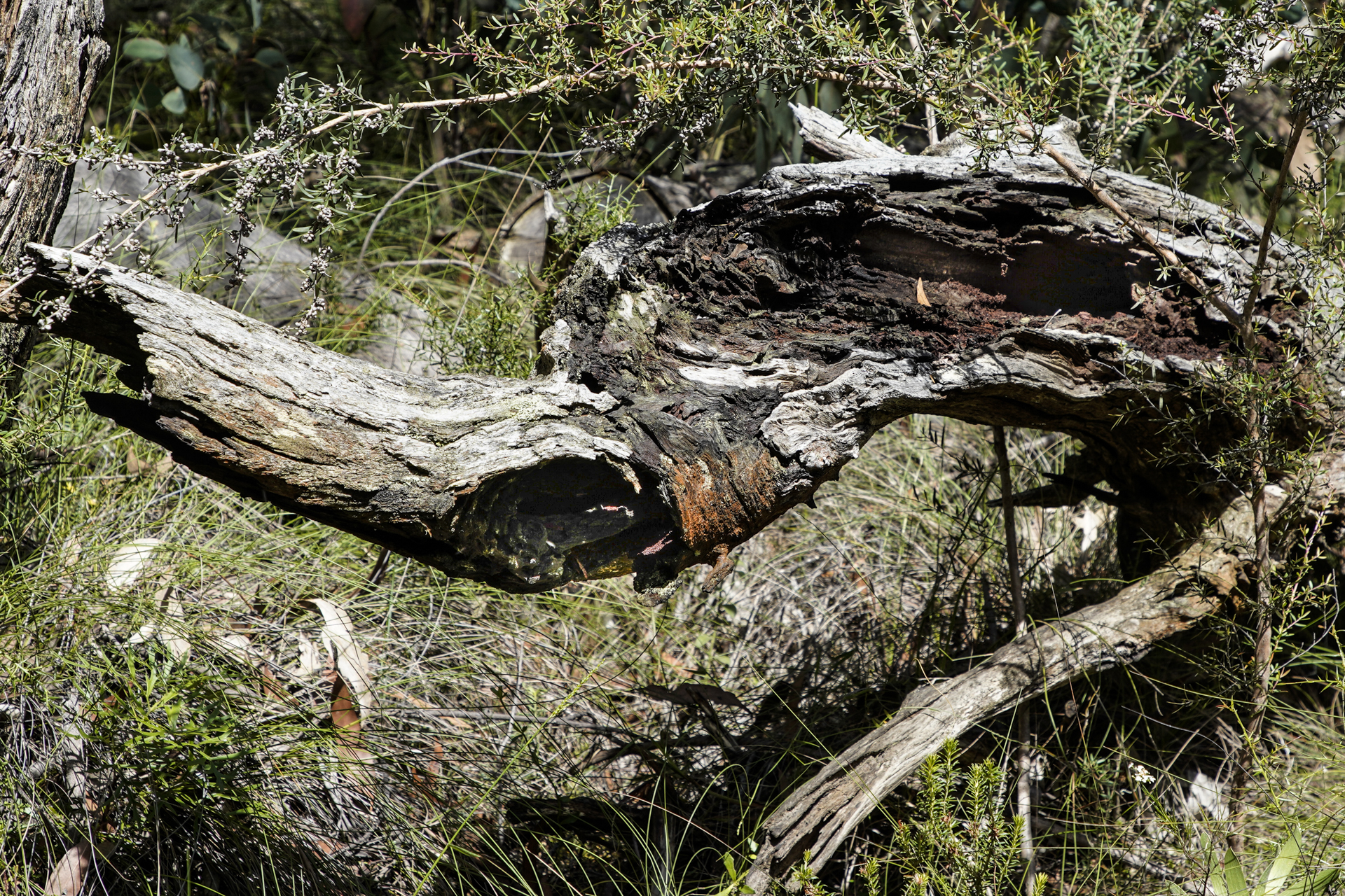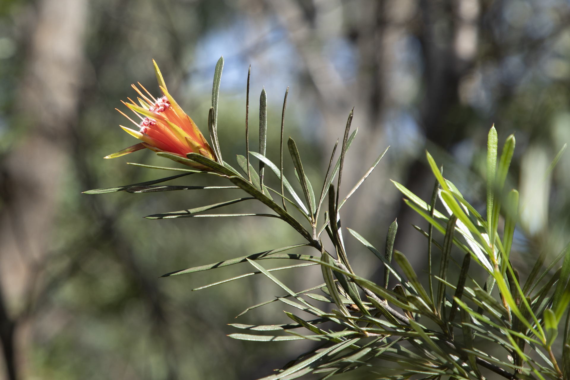 Von einem kleinen Informationszentrum aus unternahmen wir einen weiteren Gang auf dem Hochplateau. Der Fairfax Heritage Walk führt immer leicht abwärts durch einen lichten Wald, der einen völlig anderen Charakter hatte als der Hangwald der Scenic World. Die Bäume waren deutlich niedriger und dazwischen war die Auswahl an Pflanzen ebenfalls unterschiedlich. Wie sahen verschiedenste Banksia-Arten, deren typische Blütenkolben sich in ganz verschiedenen Zuständen befanden.