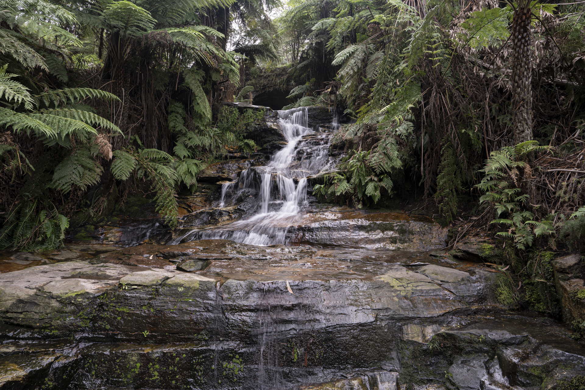 Beim letzten Ausflug machten nicht mehr alle mit. Unser Reiseleiter hatte den Weg hinunter zu den Leura Falls und zurück in den düstersten Farben geschildert. Während der Rest der Gruppe mit dem Bus schon mal zum Hotel fuhr, stieg die Unerschrockenen den Treppenweg parallel zu dem kleinen Flüsschen die Schlucht hinunter. Wegen des Regens am Vortag stand auf den langen Stufen das Wasser, so dass man immer entlang der Außenbegrenzung der Stufe balancieren musste. Aber ansonsten war der Weg nicht weiter schwierig und auch nicht übermäßig steil. Unser Reiseleiter in Fortbildung und ich waren der Gruppe weit voraus und erreichten den Aussichtspunkt am oberen Ende des Wasserfalls. Vom dem selbst war aber nichts zu sehen.