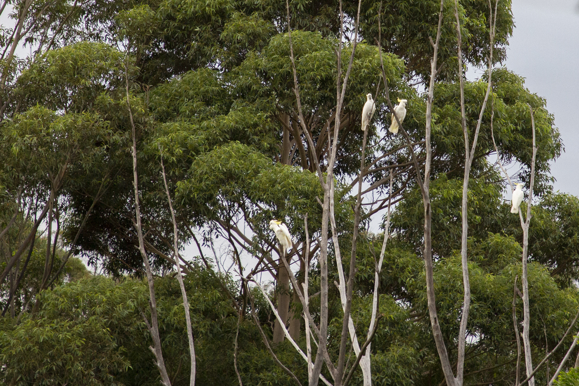 Als ich am Morgen eigentlich vor dem Frühstück Reisebericht schreiben wollte, fiel mir das Vogel-Krächzen vor dem Fenster auf. Ein Blick nach draußen ergab die Urheber des Geschreis. Ein ganzer Schwarm Gelbhauben-Kakadus tobte über der Wiese hinter unserem Hotel. Bis ich endlich meine Kamera schussbereit hatte, war der Scharm in Richtung des Randes des Hotelparks verschwunden. Aber so einfach wollte ich nicht aufgeben. Die Idee, dass es am Ende des langen Hotelflurs eventuell ein Fenster oder einen Ausgang gäbe, erwies sich als falsch. Also durch den Haupteingang, dann den Poolbereich umrundet, mehrere Ebenen Parklätze durchquert, eine Sperrung der Wege umgangen. Endlich kam ich in dem Bereich des Hotelgartens an, wo der Schwarm Kakadus herumtobte. Die Vögel zu fotografieren erwies sich als ausgesprochen schwierig. Es ist schon ein Unterschied, ob Vögel in einer definierten Umgebung wie dem Loro Parque von einer Seite einer Arena auf die andere geschickt werden. Oder ob eine Gruppe wilder Vögel mal von einem Baum zum anderen fliegt oder auch nicht.