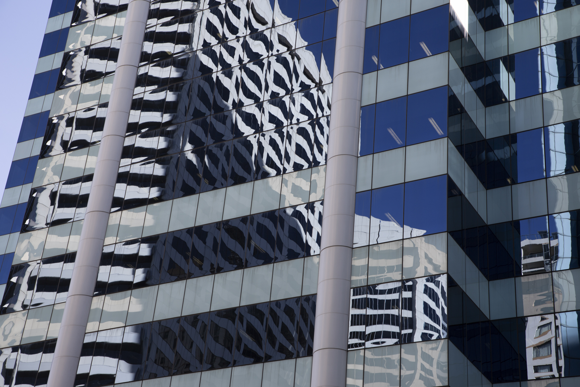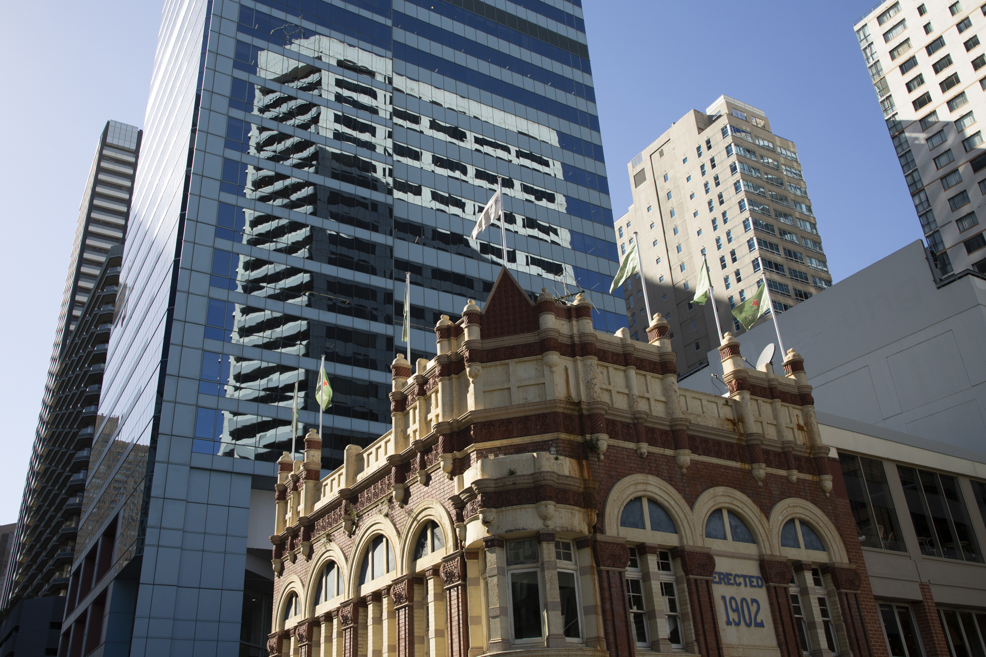 Als wir kurz nach 17:00 Uhr wieder aufbrachen, hatte sich der Himmel zugezogen. Wir streiften zwischen der George St. und der Pitt St. hin und her. Schauten in ehemalige Bankpaläste, die heute zwar moderne Geschäfte beherbergen, aber innen immer noch ihre alte Architektur behalten haben (und außen sowieso). Durchquerten das Foyer des Westin, bei dem der alte Eingangsbereich mit seiner Säulenfassade und dem Uhrturm innen übergeleitet wird in das moderne Hochhaus des Hotels. In einer Ecke auf einem kleinen Platz sagten wir dem Zeitungsleser Guten Tag (Ein auf einer Bank sitzender und Zeitung lesender seriös mit Anzug und Brille bekleideter Mann).