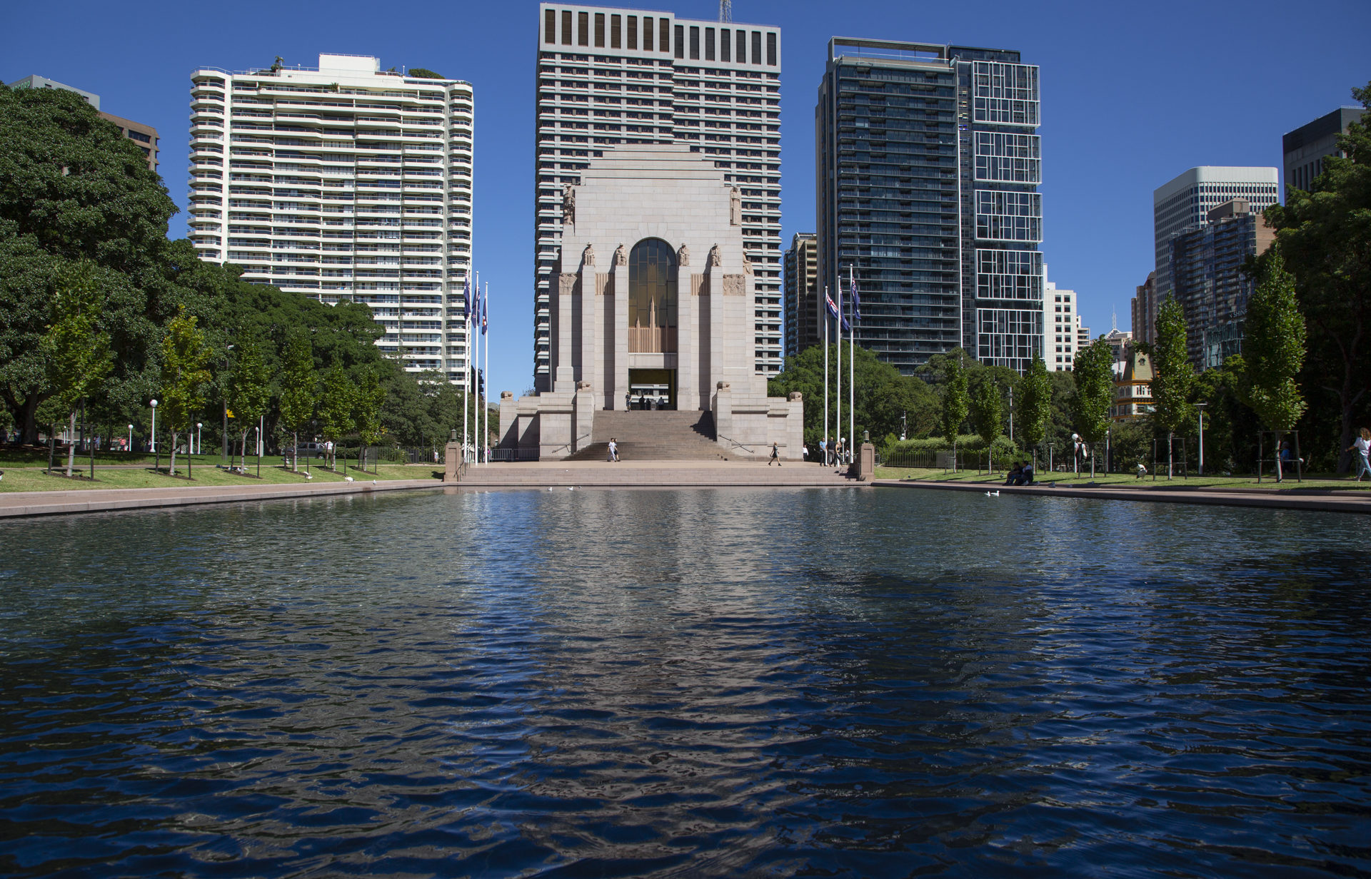 Am südlichen Ende des Hyde Parks verließen wir den Bus. Johanna und eine andere Mitreisende fuhren allerdings zurück zum Hotel. Der Rest wanderte durch den schönen Park vom ANZAC Memorial bis zur Archibald Fountain. Dazwischen hatte man immer wieder Blicke auf die angrenzenden Hochhäuser (auch das Deutsche Bank Hochhaus, das ich von dem Lego Architektur-Set Sydney kenne) und die St. Mary's Cathedral. An den Hyde Park Barracks und The Mint vorbei, mit einem kleinen Schlenker in den Innenhof des Sydney Hospital mit einem Brunnen aus bunter Keramik und einem Backsteingebäude mit romanisierenden Elemente, dann dem Parlament erreichten wir die State Library of New South Wales, wo wir vor der Statue von Matthew Flinders, der Ende des 18. / Anfang des 19. Jhdts. herausfand, dass Tasmanien eine Insel und Australien ein Kontinent ist, hielten.