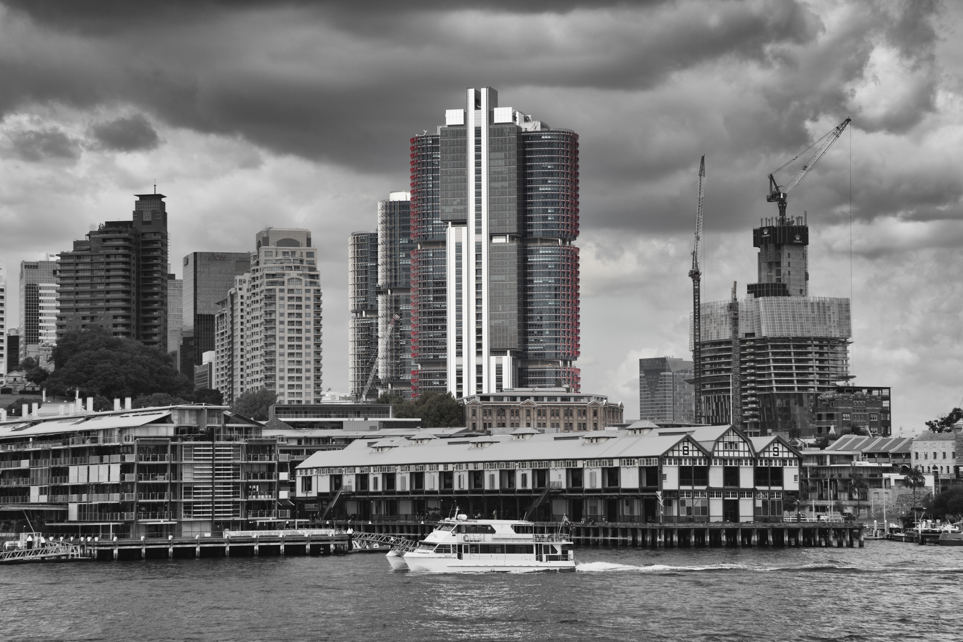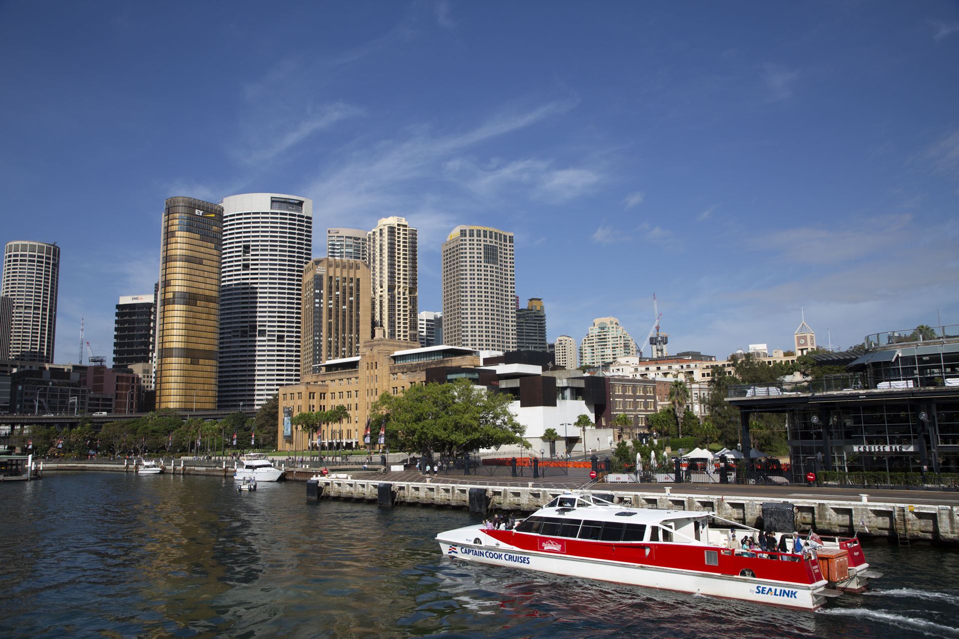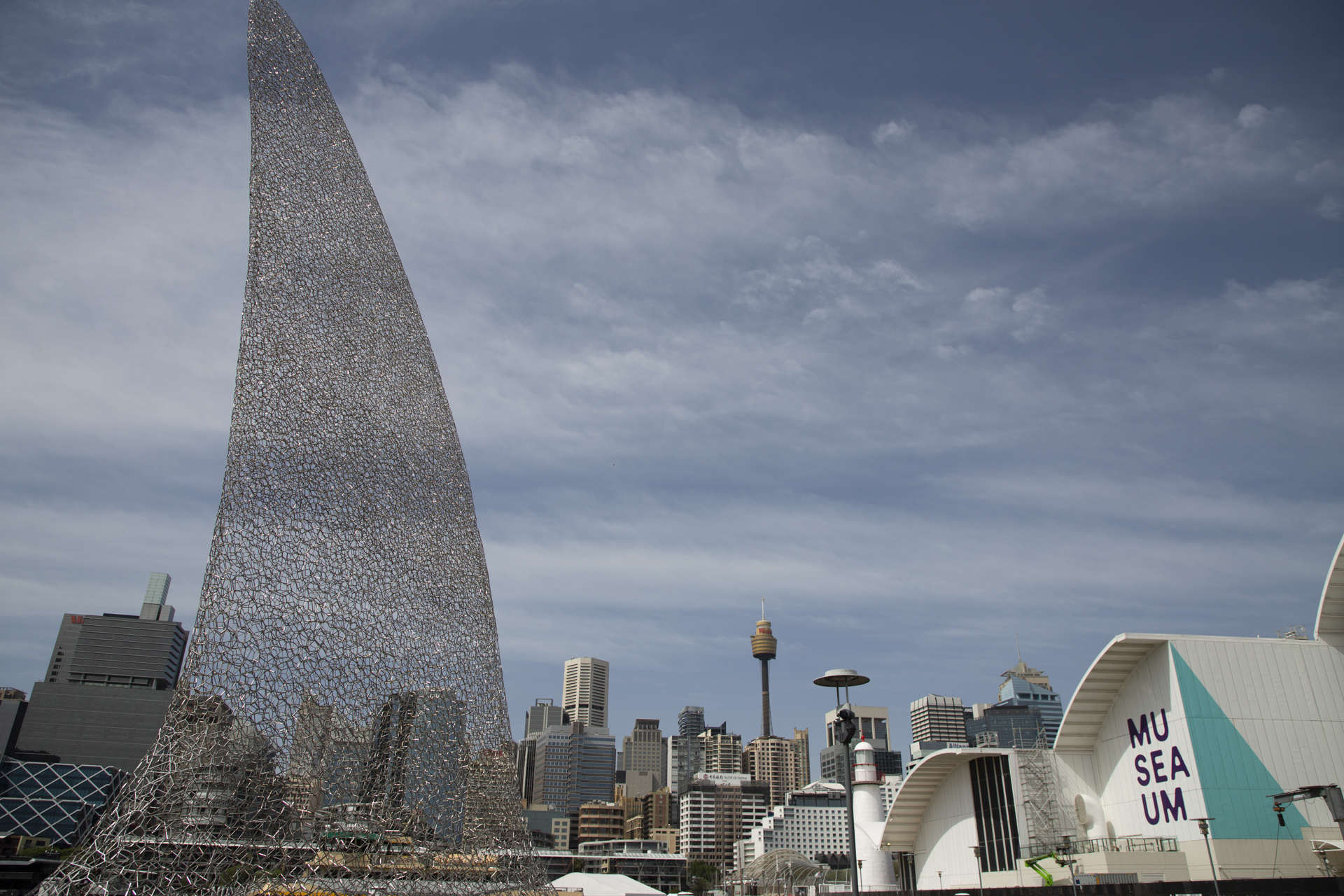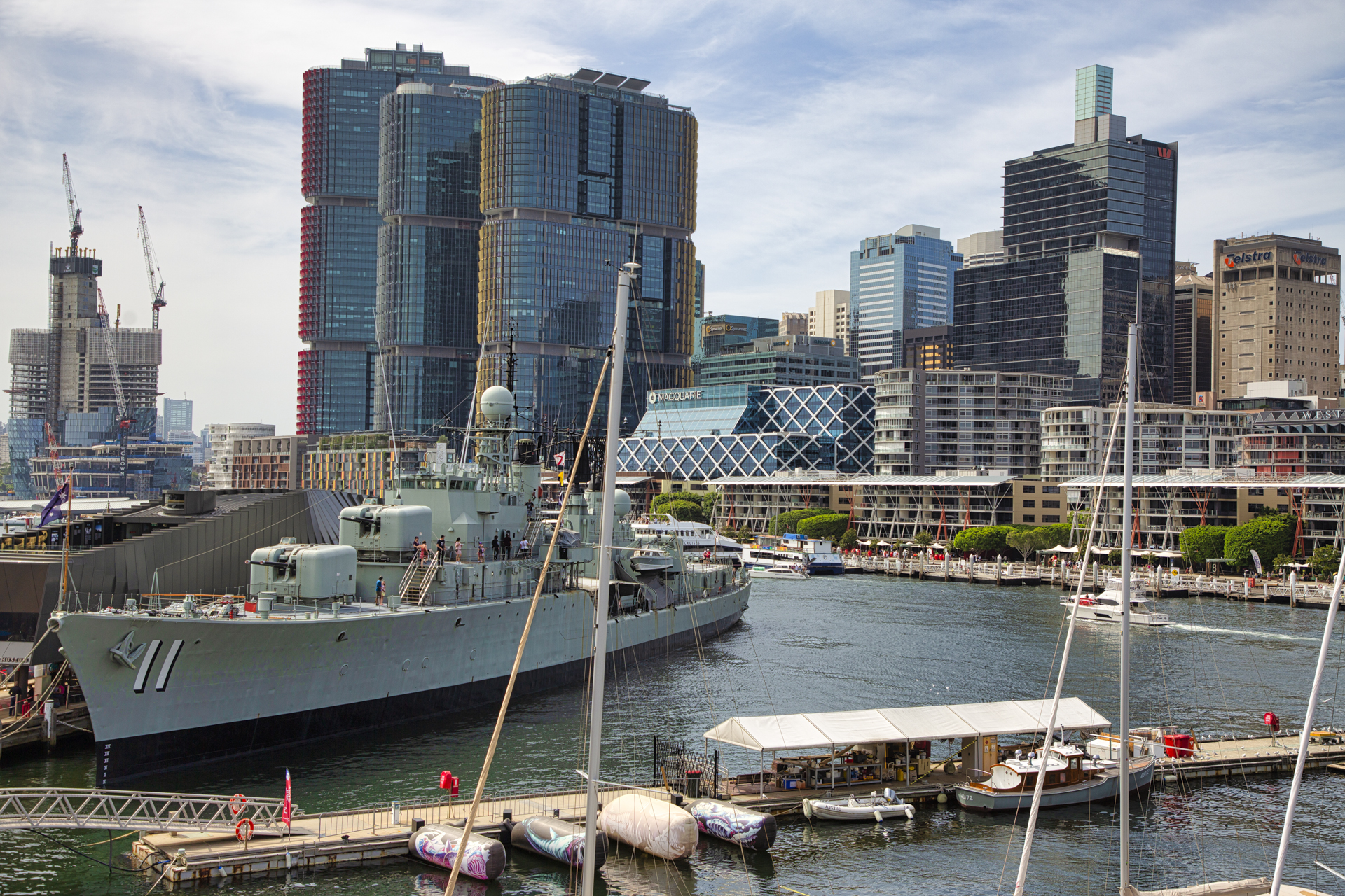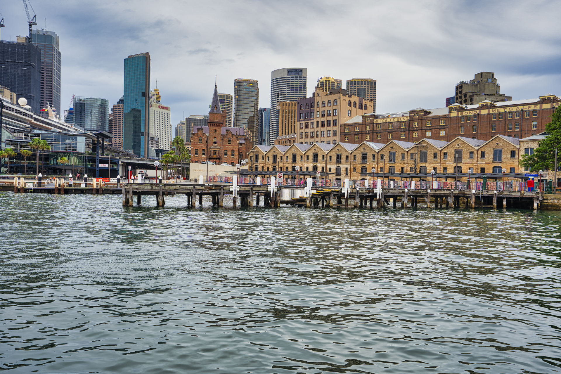 Nach kurzer Fahrt hinüber nach Darling Harbour begannen wir einen Spaziergang vom Seefahrtsmuseum ausgehend. Bei bestem Licht ragte auf der anderen Seite des Hafenbeckens die Hochhausfassade von Sydney vor uns auf. Da das Gelände vom Hafen her ziemlich ansteigt, ergibt sich eine Höhenstaffelung, nicht nur durch die Höhe der Bauwerke, sondern eben auch durch das Gelände.