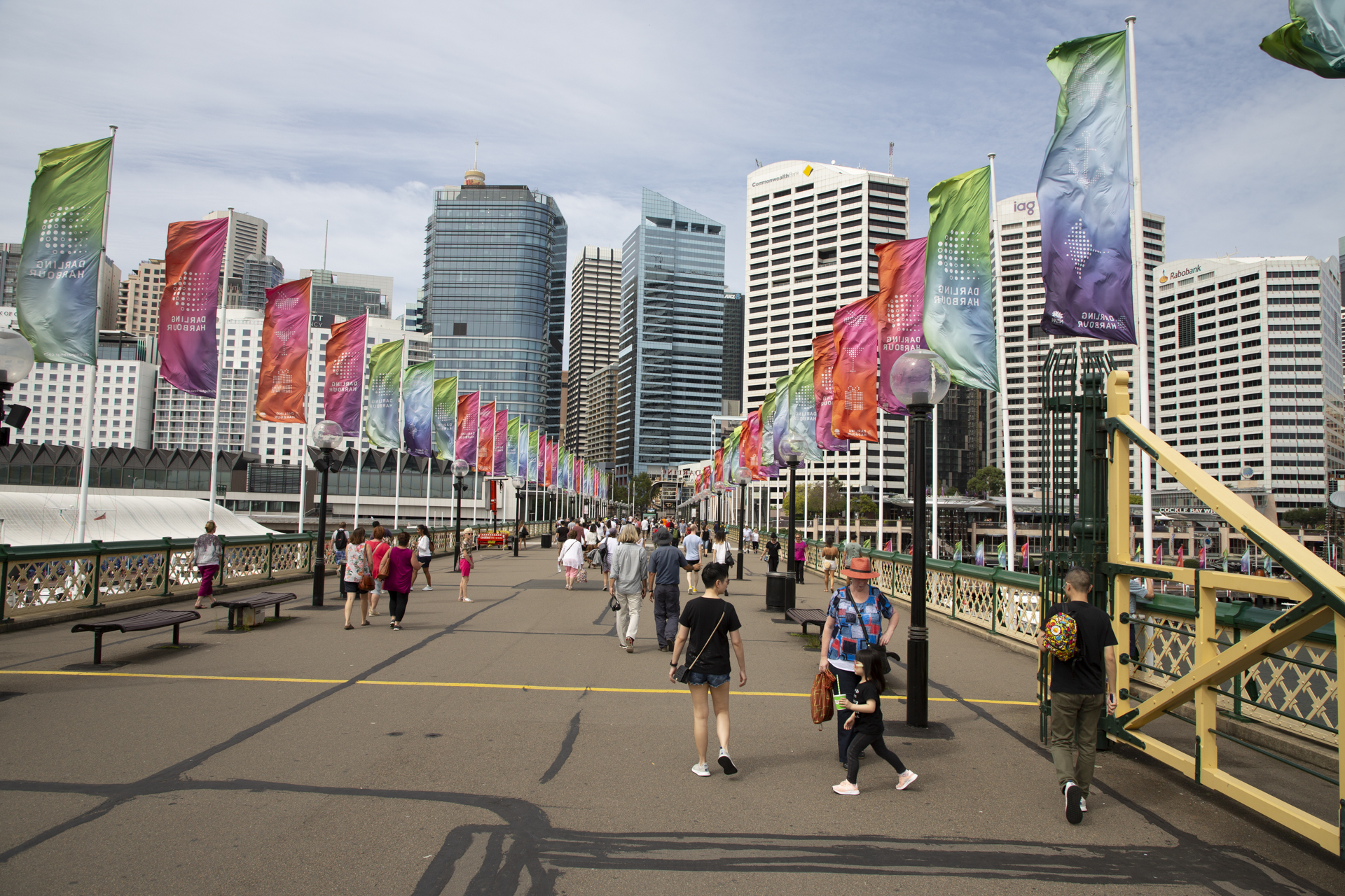 Bei Überquerung der Pyrmont Bridge hieß es einzuhalten. Die Drehbrücke wurde durch je zwei Holzzauntore auf beiden Seiten für die vielen Fußgänger gesperrt. Dann begann sich die Brücke mit ihrem malerischen Brückenhäuschen zu drehen, bis sie senkrecht zur Hafenachse stand. Ein Schiff erschien aber nicht. Es stellte sich heraus, dass das am Wochenende nur gemacht wird, um die Mechanik am Laufen zu halten.