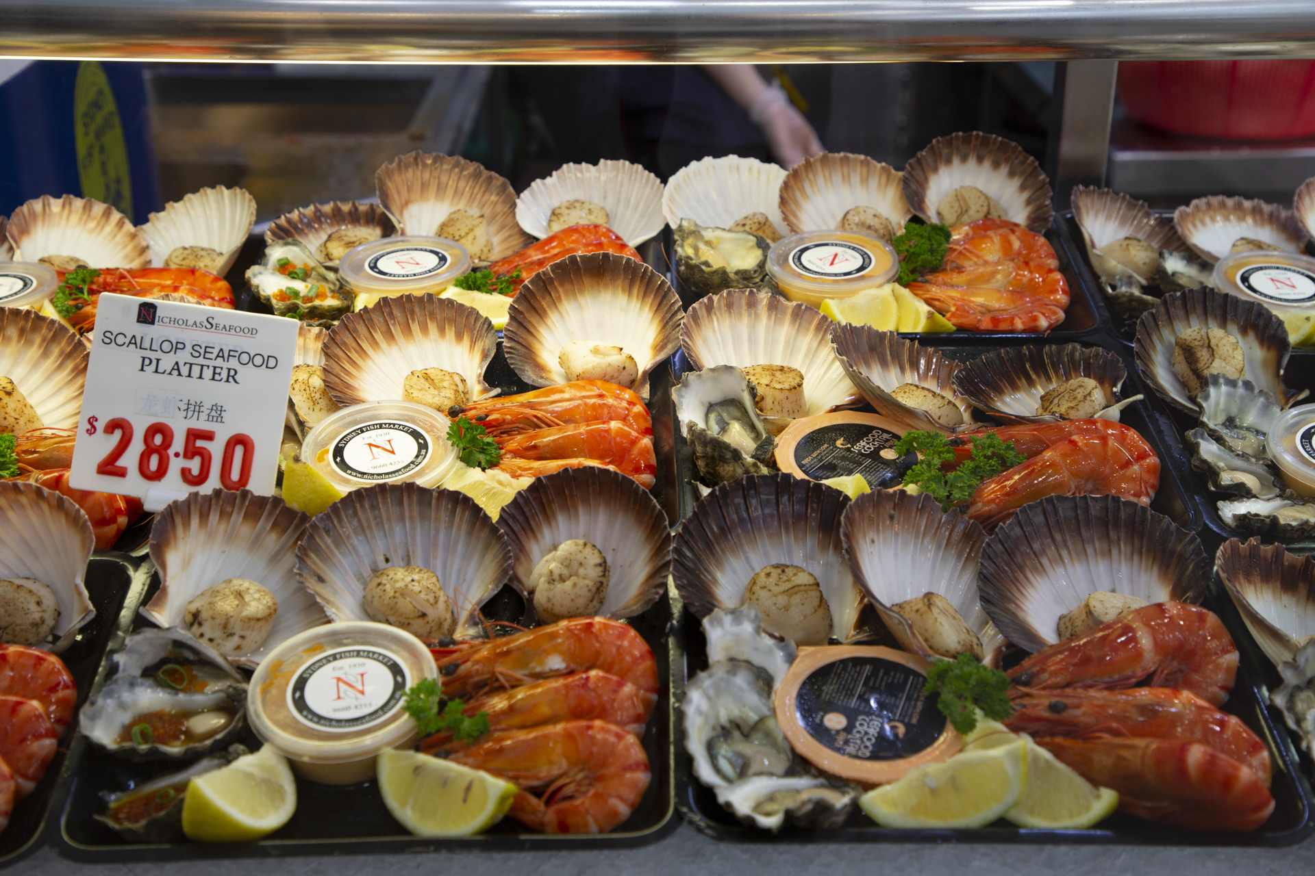 Bereits beim ersten Durchgang durch die Markthalle als auch nach dem Essen realisierten wir, welches unglaubliche Angebot an Fischen und Meeresfrüchten es im Markt gibt. Muscheln aller Art, von denen ich einige auch noch nie gesehen hatte (auch die grünen Miesmuscheln, die Diskussionsstoff während der Reise gegeben hatten, gab es. Allerdings aus Neuseeland). Natürlich Prawns in allen Größen. Unglaublich viele Fischsorten, in Ganz und an den Sashimi Stationen auch verzehrfertig. Seeigel fand ich. Becken mit Langusten (Rock Lobster, lebend ca. 190 AUD das Kilo. Und die Burschen sahen aus, als hätten sie ein paar Kilo). Alle möglichen Krebs- und Krabbenarten, darunter schwarze Mud Crabs und Riesenkrabben, die Größe und Form eines Footballs hatten.