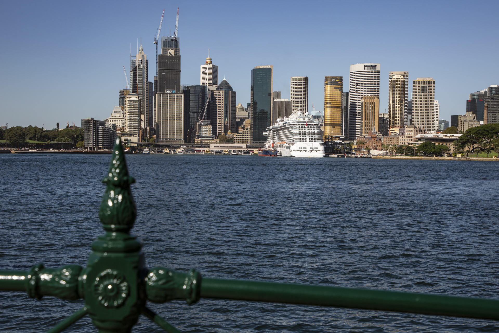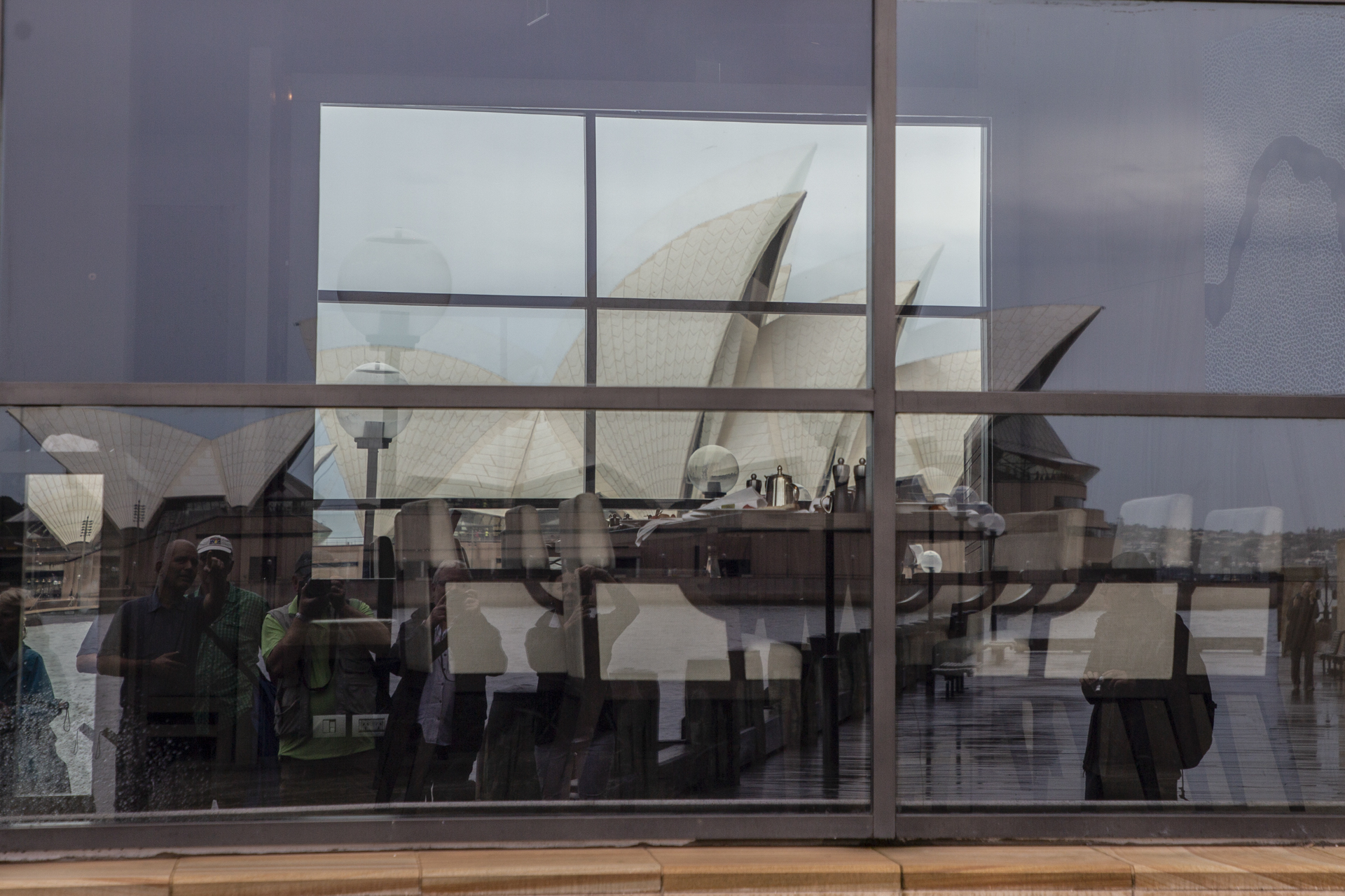 Nach der Tour gestern meldete sich Johanna für heute erst mal ab. Im leichten Regen marschierte die Gruppe los. Unser Reiseleiter steuerte The Rocks an und zeigte uns in kleinen engen Gässchen Cafés, Clubs und Restaurants, die man wohl nie gefunden hätte, wenn man nur die Hauptstraßen geht. Wir kamen in Höhe des Park Hyatt wieder ans Wasser. Schon von etwas weiter oben war das Kreuzfahrtschiff zu sehen, dass am International Passenger Terminal angelegt hatte, die Carnival Legend. Obwohl auch kein richtig großes Schiff, dominierte es dennoch den ganzen Hafen. Inzwischen hatte es zu regnen aufgehört und wir konnten von der Landspitze ein paar gute Fotos, wenn auch bei schlechtem Wetter machen, inklusive ein paar Spiegelbilder durch den Frühstücksraum des Park Hyatt.