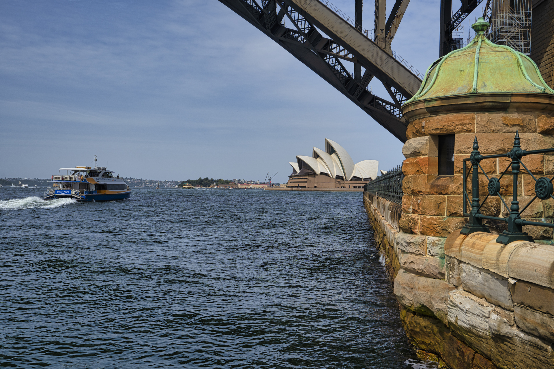 Auf der anderen Seite sammelte uns der Bus wieder ein, wir fuhren durch die Baustelle des neu entstehenden Casinos in Barangaroo und hielten erneut, direkt unter der Auffahrt der Harbour Bridge bei Dawes Point. Von hier konnte man schon das Opernhaus sehen, was einige aus der Gruppe, mich eingeschlossen, veranlasste, sich weiter und länger als geplant von der Truppe zu entfernen, um weitere Fotos zu machen. Der Tadel unseres Reiseleiters fiel zum Glück moderat aus.