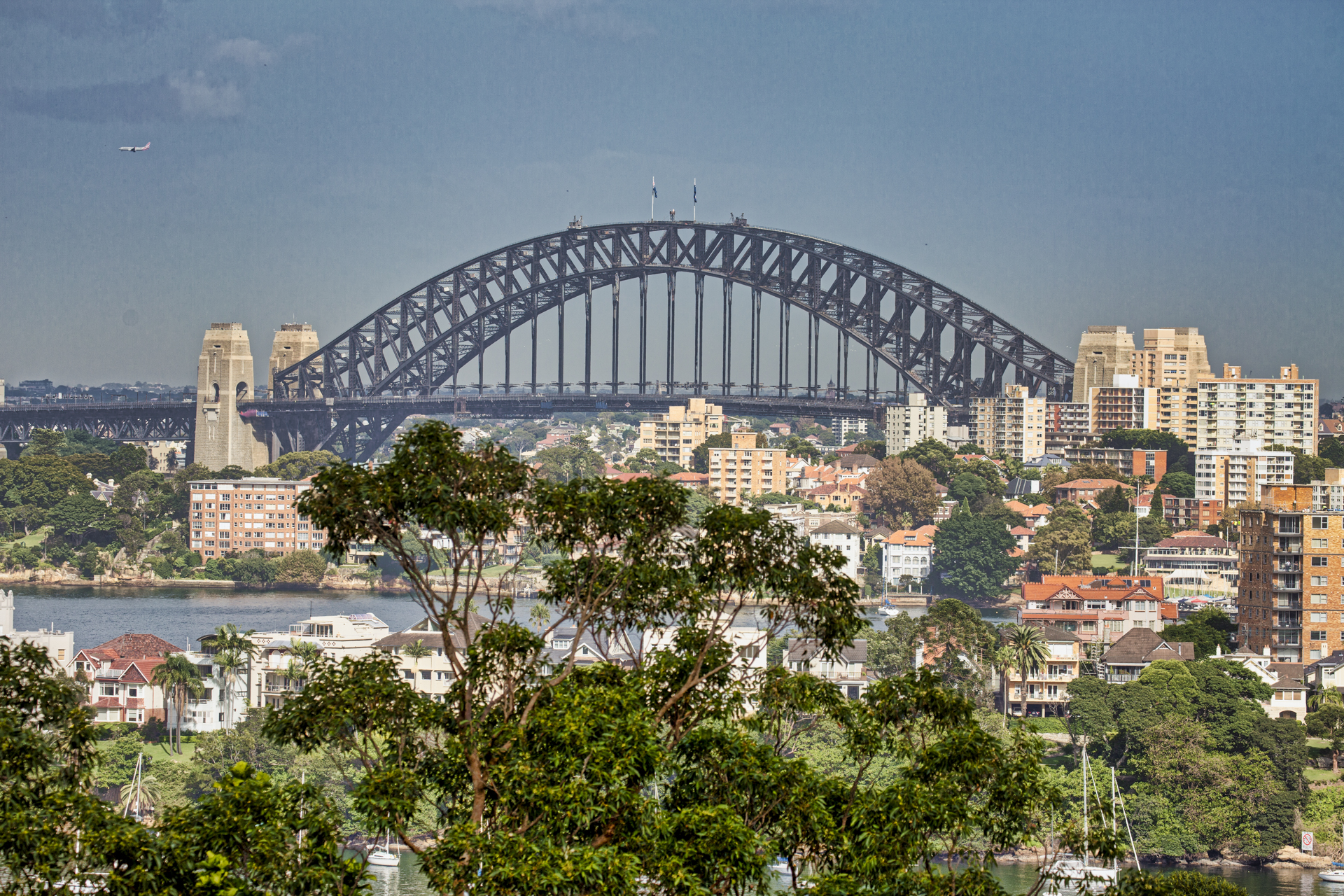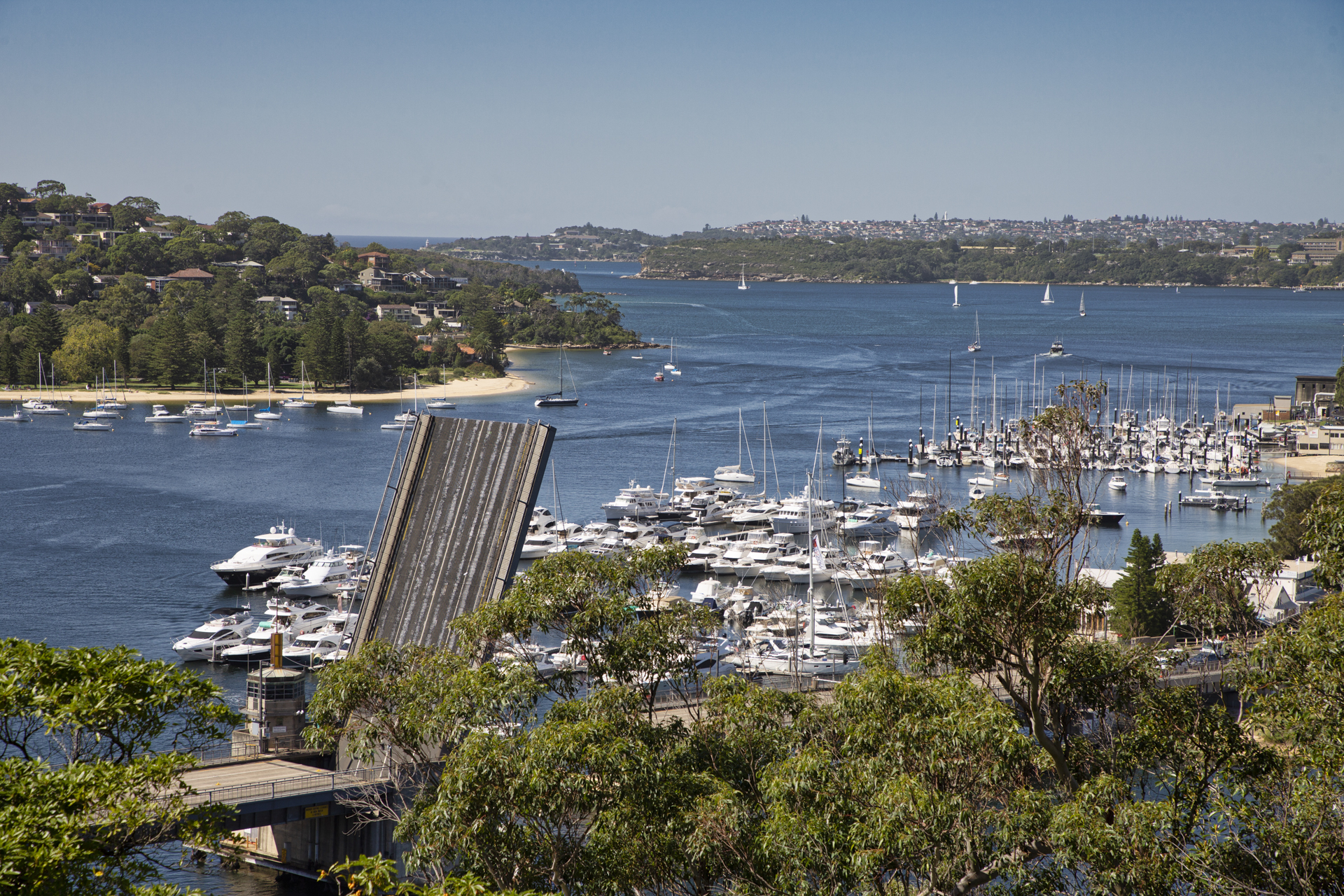 An einem Aussichtspunkt oberhalb der Bucht The Spit gab es erneut Grund zum Staunen und für zahlreiche Fotos. Unter uns lag die Hafenbucht und die davon ausgehende Bucht The Spit. Die Schwenkbrücke hatten wir ein paar Minuten zuvor überquert. Jetzt hob sie sich tatsächlich, um einem kleinen Segelboot die Ausfahrt in die Hafenbucht zu ermöglichen. Dabei war das kleine Segelschiff im Vergleich zu den anderen Wasserfahrzeugen, die von oben zu sehen waren, geradezu ein Witz. Hier lag wohl das Bruttosozialprodukt so manchen Staates auf dem Wasser herum. Nicht zu vergessen die Häuser an den steilen Hängen. Die sahen zwar jetzt nicht alle richtig neu und schick aus, aber die Lage der Grundstücke bedeuteten den wahrscheinlich immensen Wert der Immobilien rund um den Sydney Harbour.