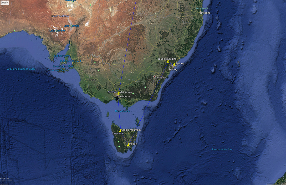 Nach einem etwas wackeligen Anflug auf Sydney durch die Wolken hatten wir plötzlich freie Sicht auf die Stadt. Das bekannte Panorama mit Harbour Bridge, Opernhaus etc. breitete sich in klarer Luft an der Seite aus. Leider hatte ich kein fotografisches Equipment bei der Hand.