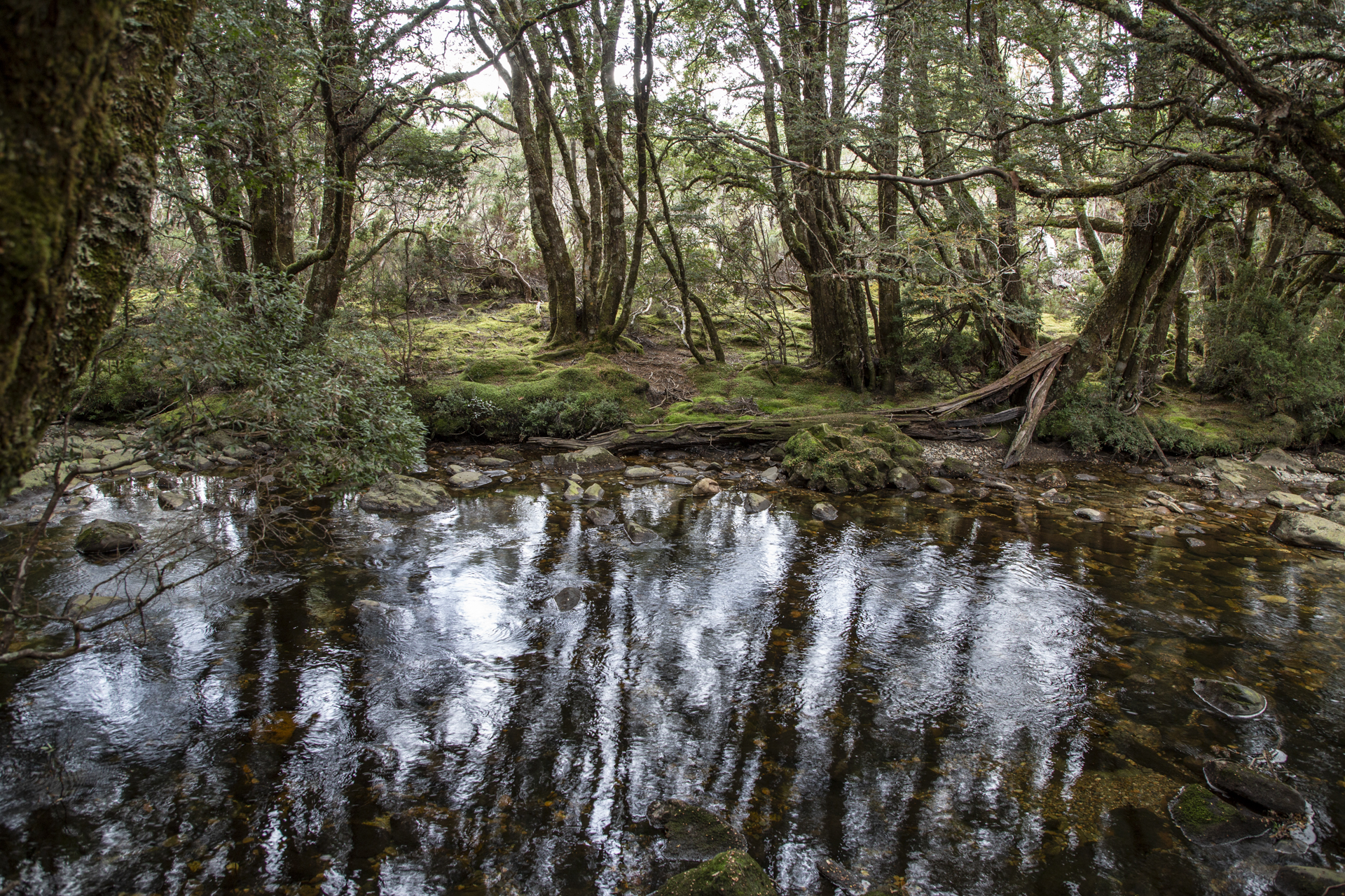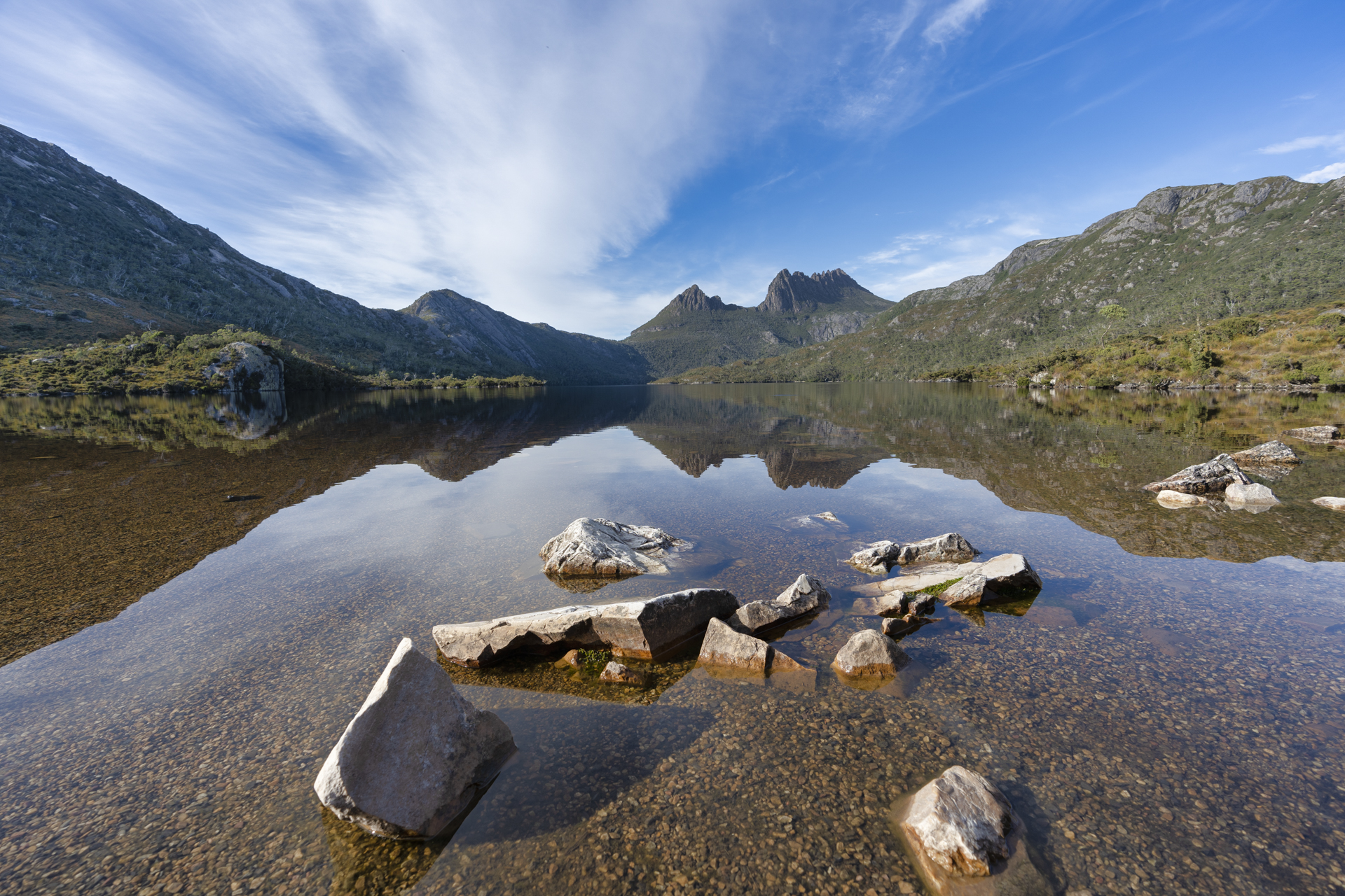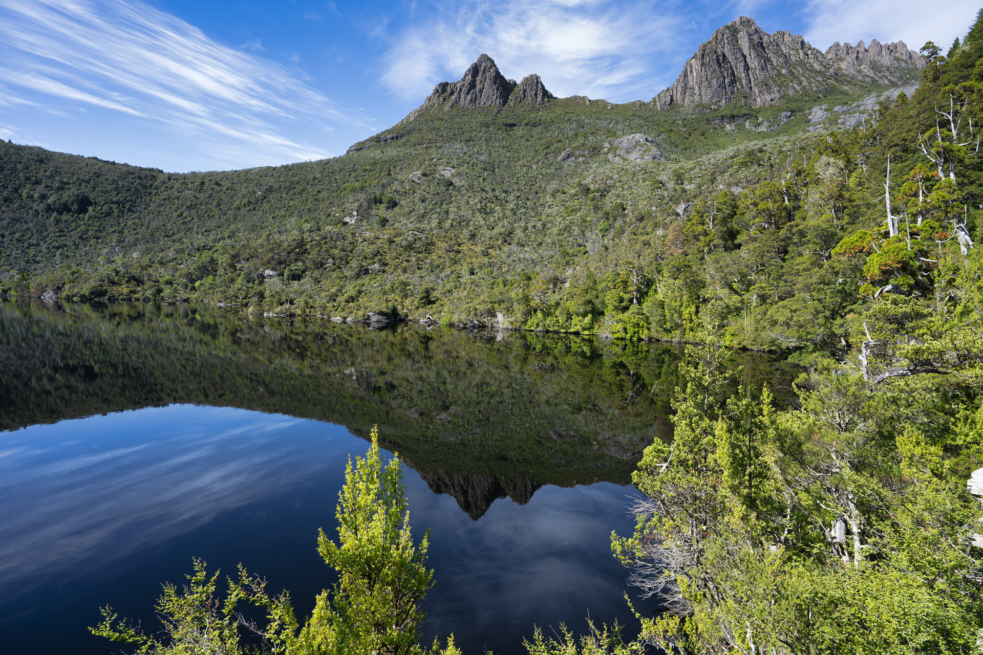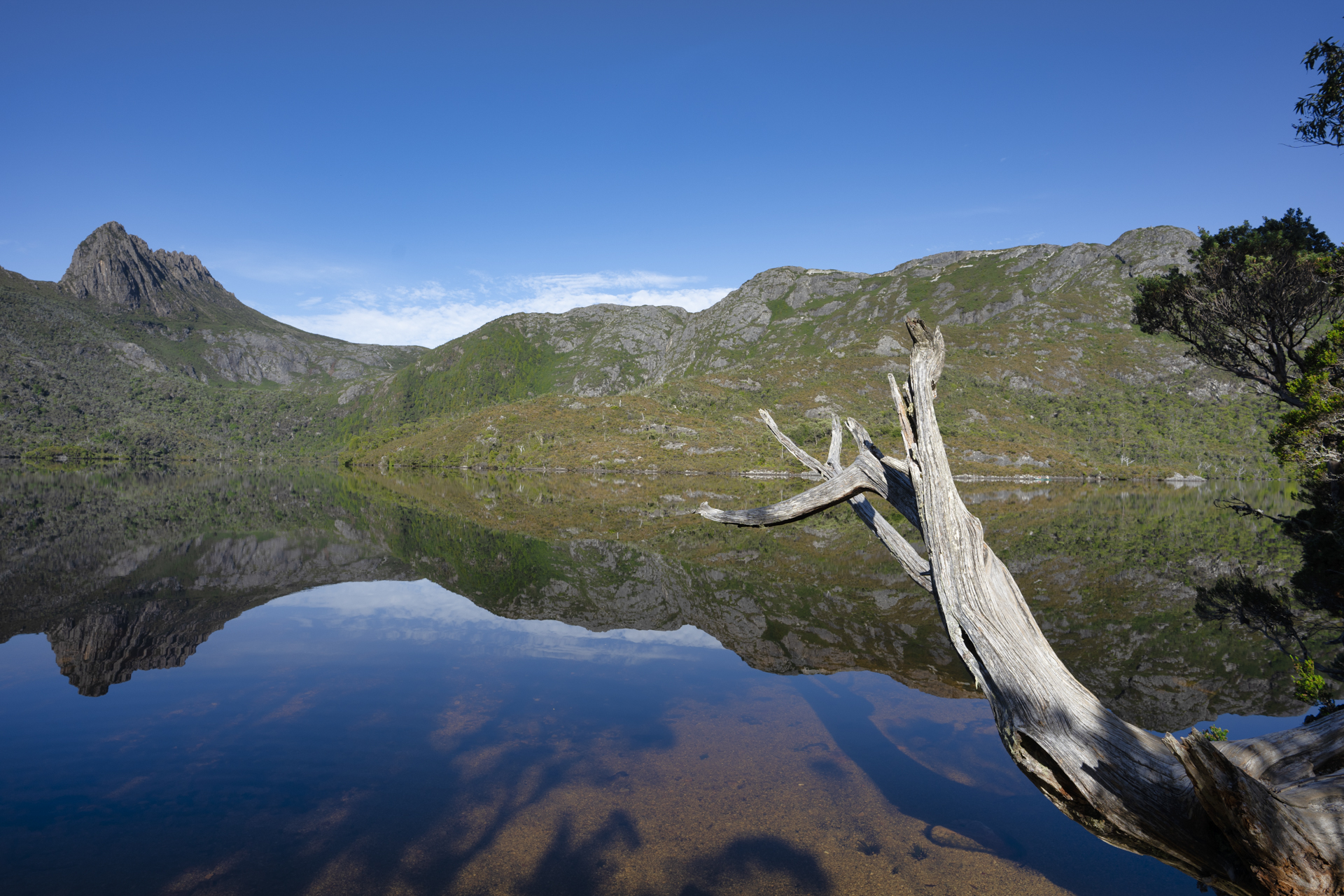 Nach dem Frühstück brachte uns ein Shuttle zum Lake Dove, der malerisch direkt vor dem Cradle Mountain liegt. Es war zwar noch ein klein wenig frisch, aber die Sonne kam schon durch und wie hatten bestes Licht. Der See selbst war spiegelglatt, wodurch sich die ganzen Berge und insbesondere der Cradle Mountain im Wasser spiegelten.