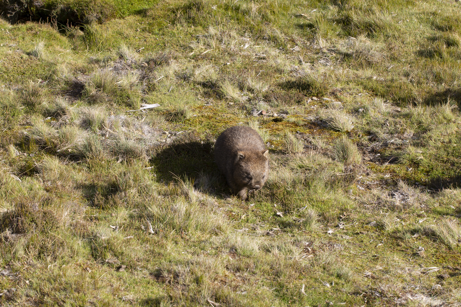 Kaum wieder im Zimmer rief mich Johanna auf die Terrasse. Von dem kleinen Teich herauf marschierte ein Wombat direkt auf unsere Hütte zu und begann in einem Busch direkt vor unserer Terrasse Gras zu fressen. Nach einer ganzen Weile tauchte er auf der anderen Seite des Busches wieder auf und fraß sich durch das Gras an den Hütten entlang, ohne sich weiter um die Touristen um ihn herum zu kümmern.