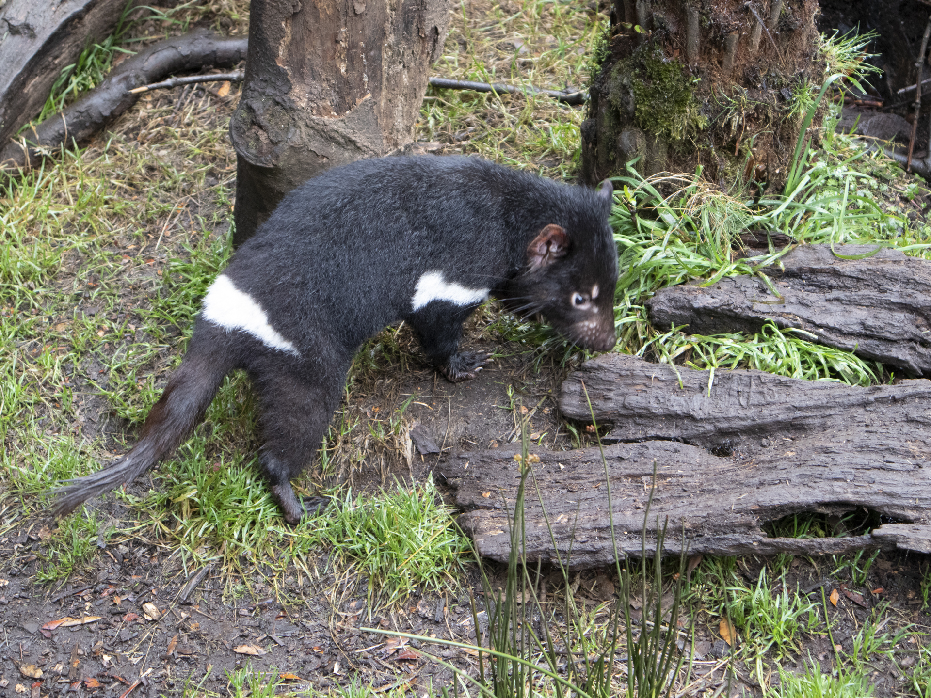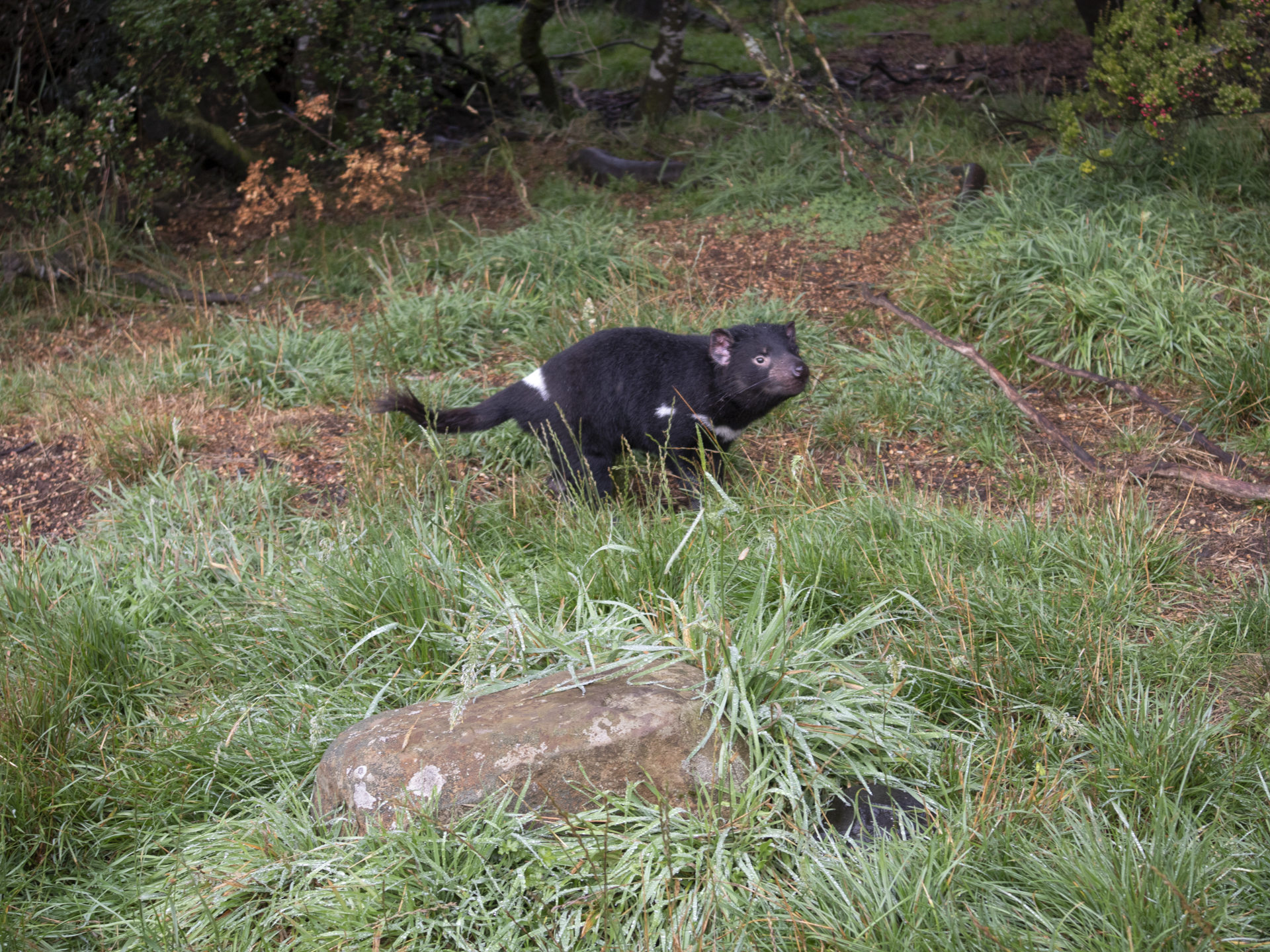 Wir fuhren nur ein paar hundert Meter zur Tierpflegestation mit Tasmanischen Teufeln und Quolls. Der Tasmanische Teufel ist ein Allesfresser, aber hauptsächlich Jäger und Aasfresser und lebt alleine ohne ein Territorium. Leider ist die Population bedroht durch eine Krebserkrankung, die sich nicht viral, aber durch Kontakt verbreitet. Und da sich die Tasmanischen Teufel bei Begegnung gerne mal kappeln, führt das zu einer weiteren Verbreitung der nicht-heilbaren Krankheit. In der Tierpflegestation betreibt man ein Populationsmanagement. Gesunde Tiere werden quasi in Quarantäne gehalten und gezüchtet. Durch ihren angeborenen Jagdinstinkt und die Lebensweise ohne Territorialanspruch können die Tiere einfach ausgewildert werden. In den Gehegen tummelten sich mehrere Generationen Jungtiere. Die erwachsenen Tiere können bis zu 12 kg schwer werden. Die Tiere sehen eigentlich ganz putzig aus, wen sie aber das Maul öffnen sieht man die langen spitzen Reißzähne!