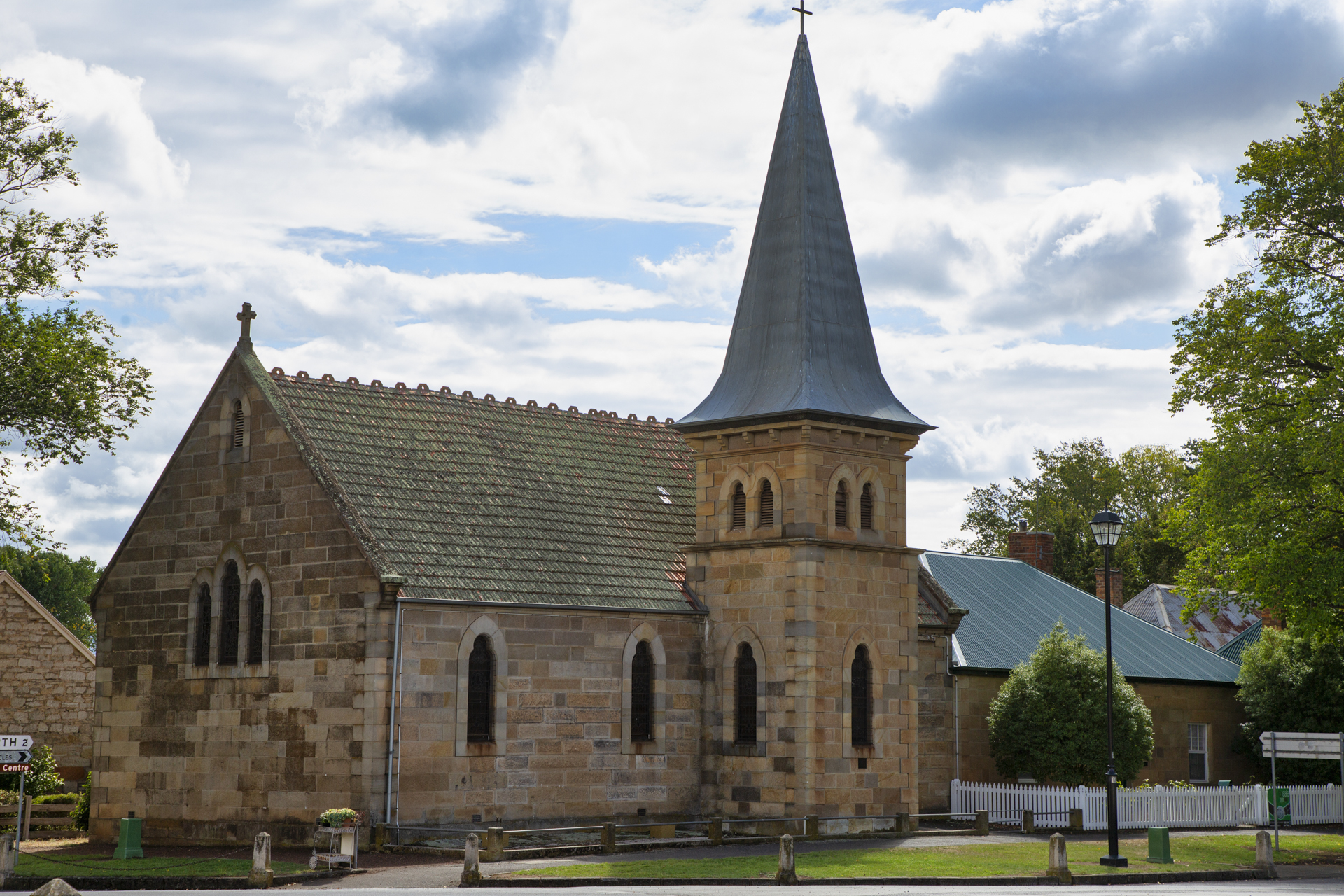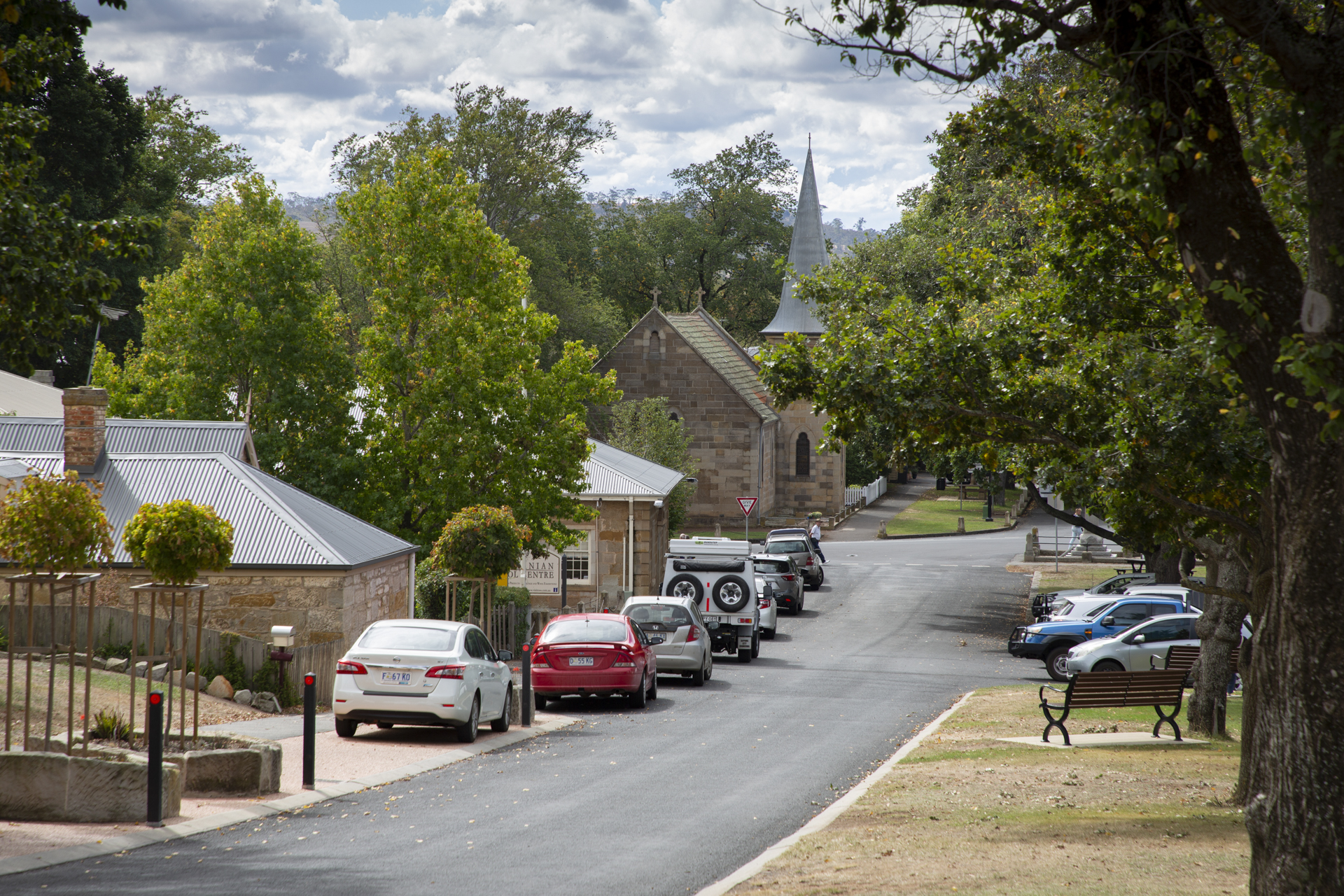 Ross erreichten wir gegen 14:00 Uhr. Das Örtchen liegt inmitten der Weiden auf sanften Hügeln und macht mit seinen in beige gehaltenen Häuschen, Kirchen und dem Kolonialhotel einen schmucken Eindruck. Hier gab es ursprünglich ein Frauengefängnis und damit Wollproduktion. Heute noch findet man deshalb eine Art Wollmuseum. Zu der Bäckerei mit den Scallop Pies schafften es nur unser Reiseleiter in Fortbildung und ich, wobei er einen anderen Pie nahm. Der Scallop Pie hatte so etwa 10 cm Durchmesser und war satt mit kleinen Jakobsmuscheln in einer cremigen grünen Currysoße gefüllt. Sehr lecker, aber auch sehr mächtig. Eigentlich hätte ich danach durchaus einen Schnaps vertragen.