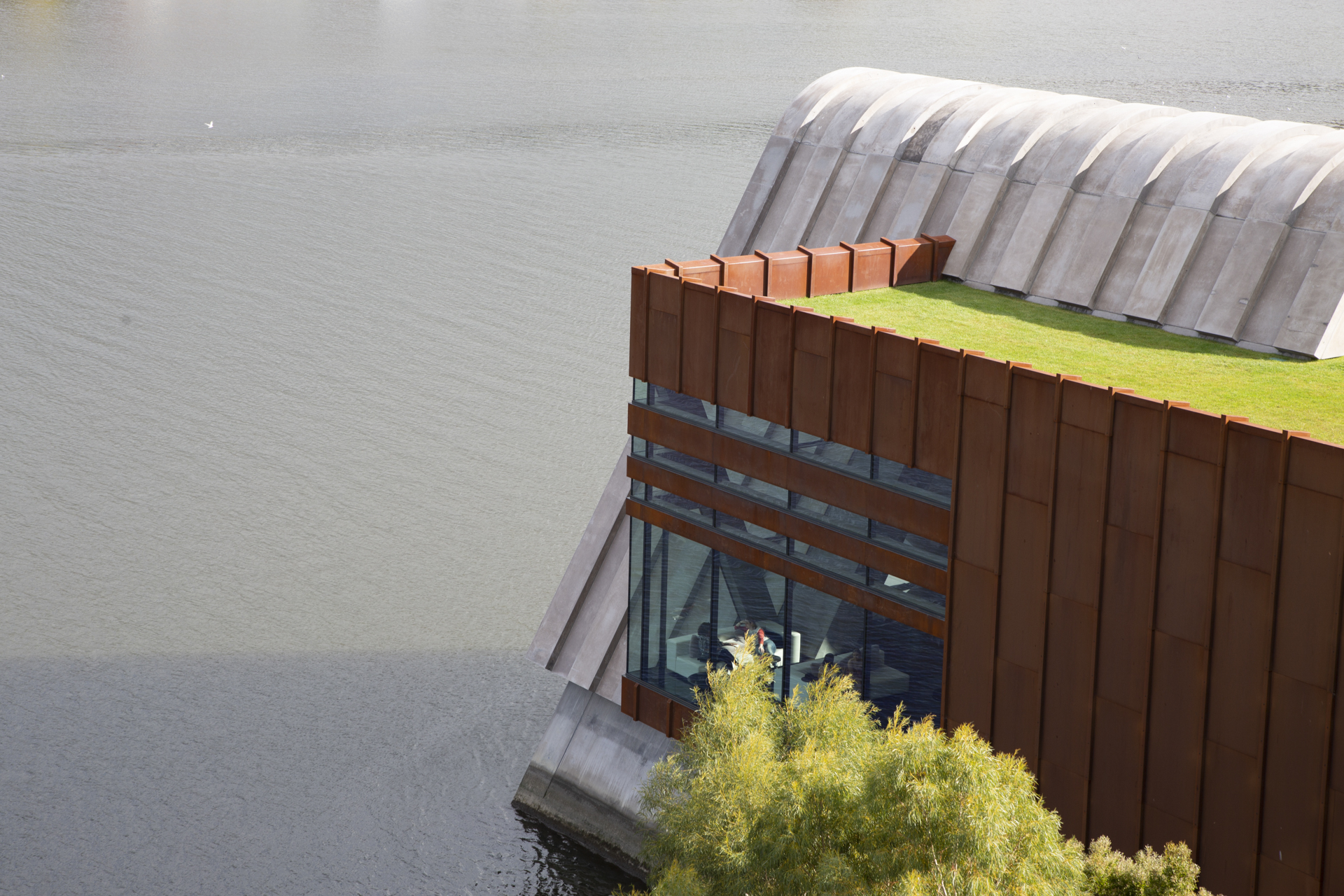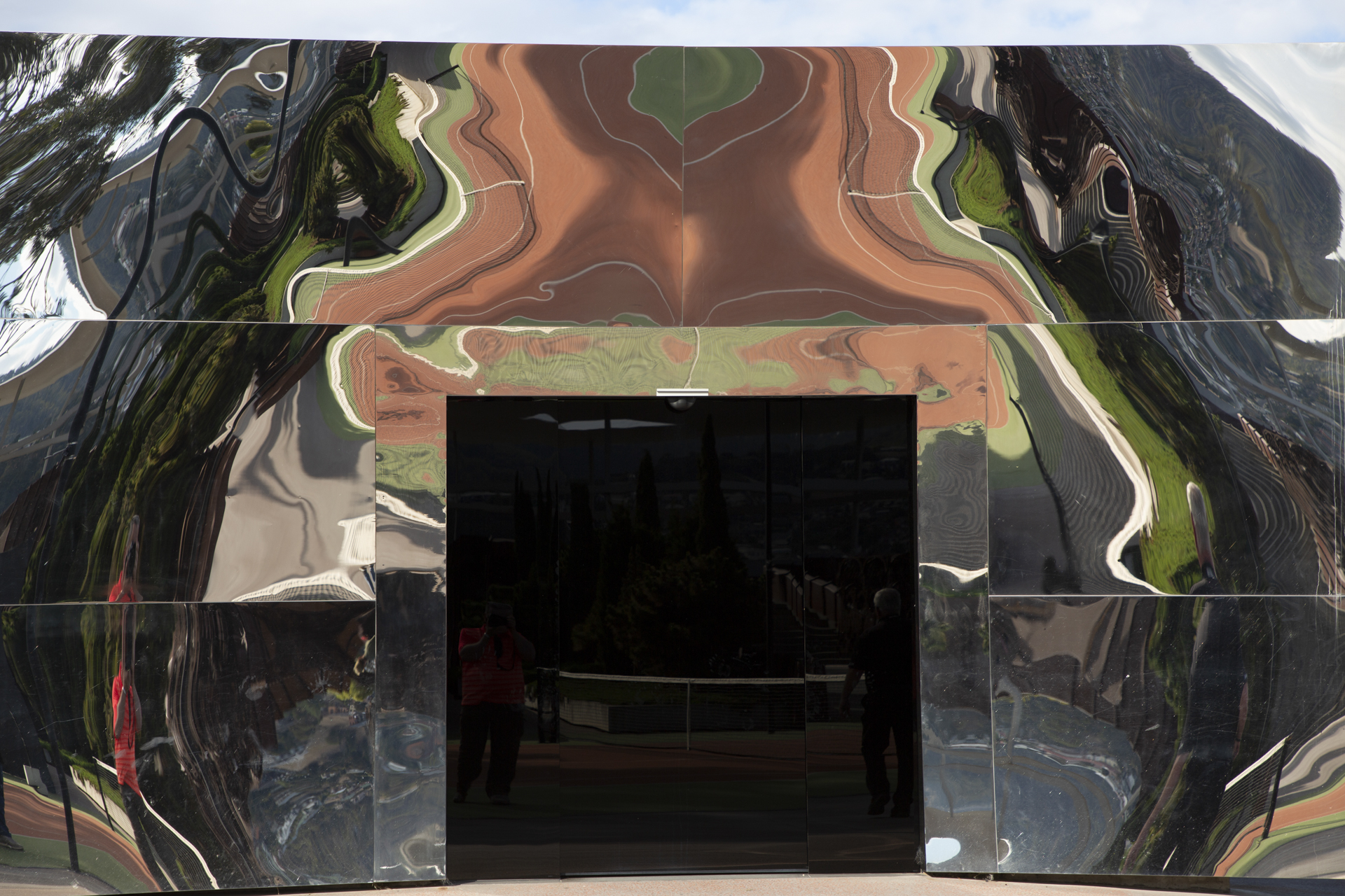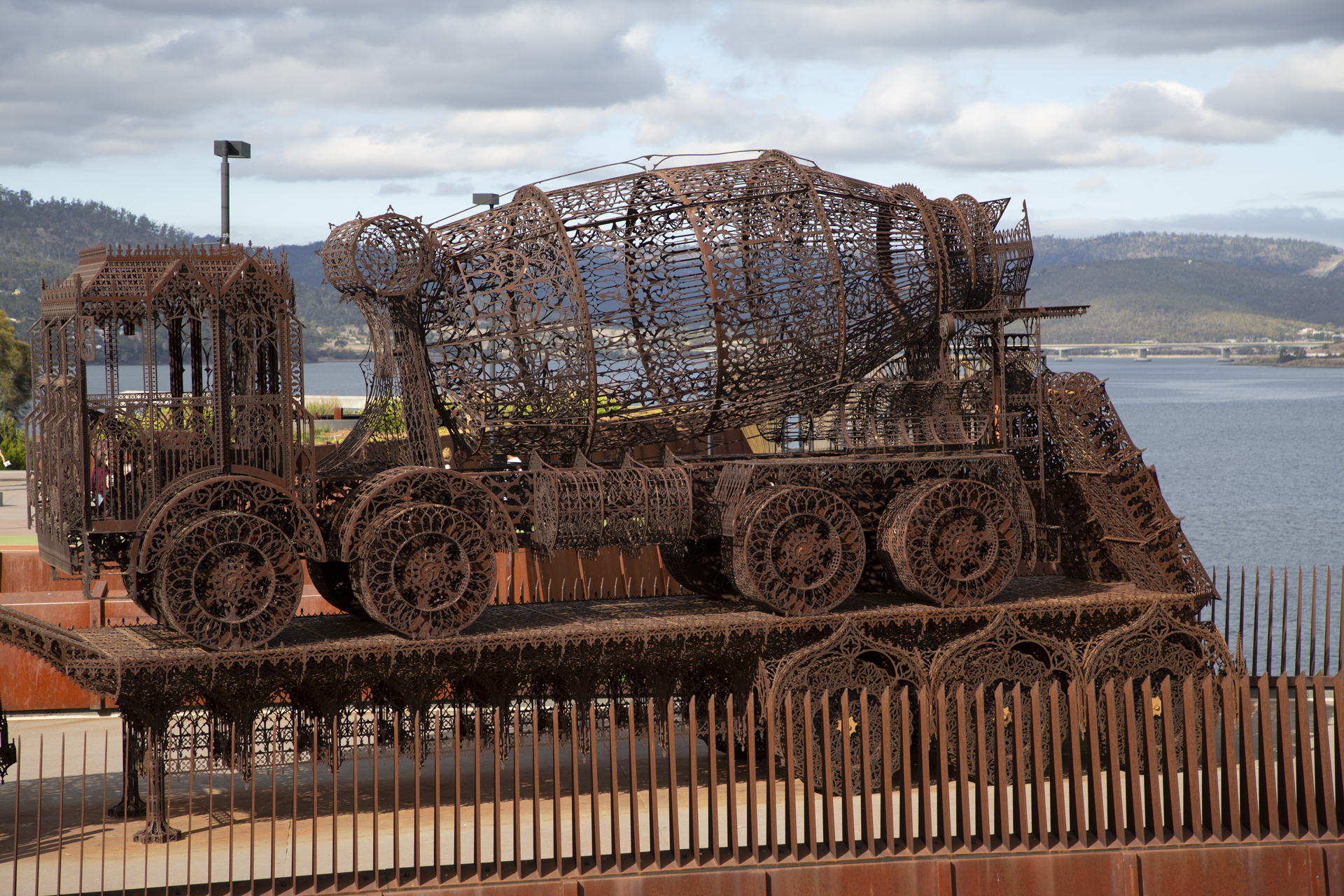 Fast schon in Hobart machten wir noch ein Stippvisite beim MONA (Museum of Old and New Art). Das Museum, das nach unten in den Hang gebaut ist, konnten wir aus Zeitgründen nicht besichtigen, aber die anderen Gebäude und Installationen rund um das Museum boten auch ein paar interessante Dinge. Bemerkenswert etwa ein fast lebensgroßer Sattelschlepper mit Betonmischer auf dem Trailer. Das Ganze aber aus Schmiedeeisenelementen, die scheinbar von Kirchen, Kathedralen oder Schmiedeeisenpavillons zu stammen schienen. Der Eingangsbereich ist metallisch verspiegelt. Der Tennisplatz vor dem Eingang, der an dieser Stelle völlig sinnlos wirkt, war wohl explizit dazu angelegt worden, um eine entsprechende Spiegelwirkung im Eingang zu erzeugen. Insofern bot auch der Kurzaufenthalt eine Reihe Fotomotive.