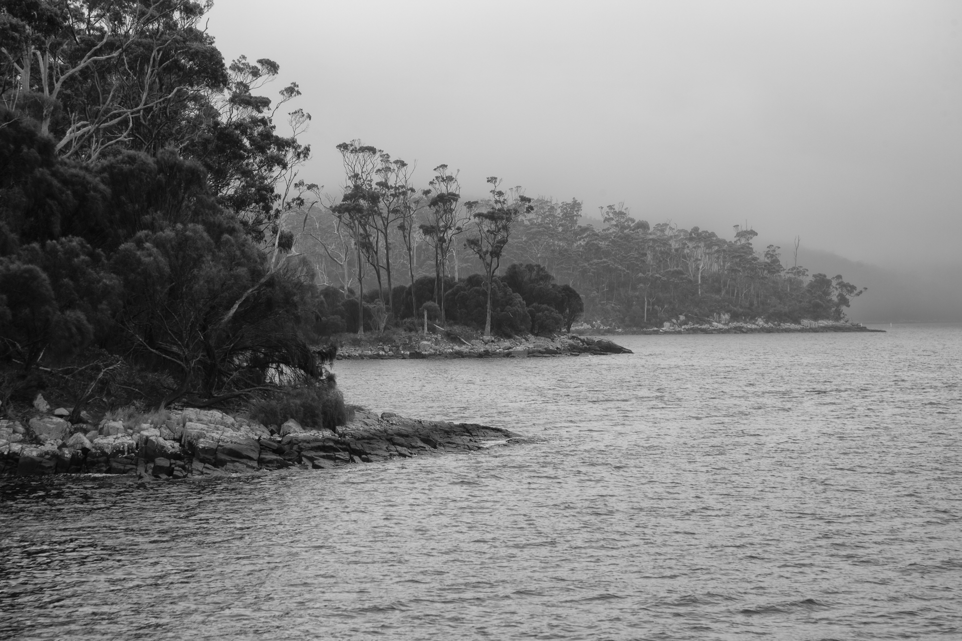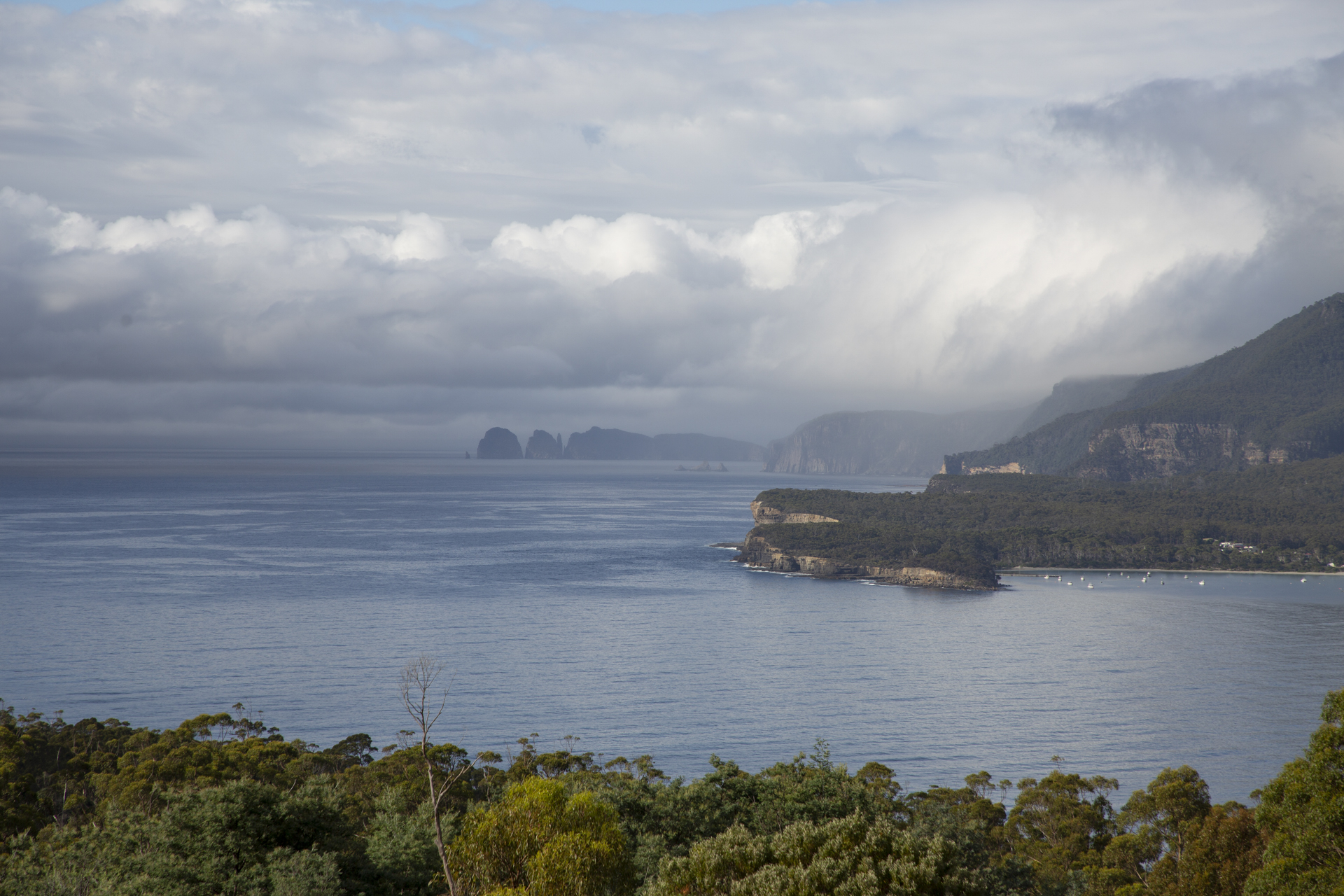 Einen Zwischenstopp legten wir oberhalb der Küste mit einem sehr schönen Blick auf die Pirates Bay ein. Da zeigte sich auch ein wenig Sonne zwischen den Wolken, aber die Küstenlinie und die Felsformationen weiter entfernt verschwanden im Nebel.