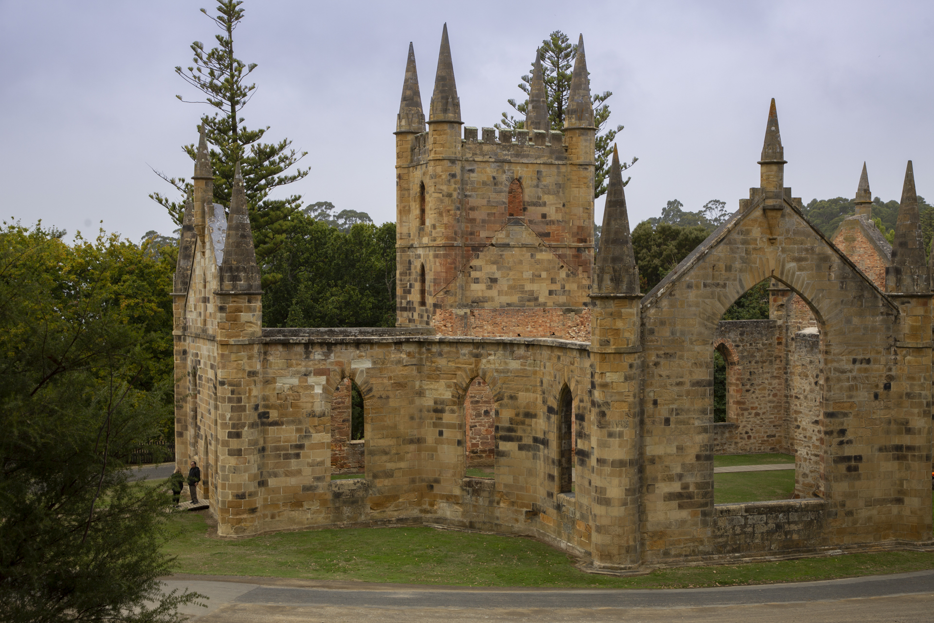 Nach einem schnellen Gang durch die zentrale Parkanlage hinauf zur Ruine der Kirche, die eines der Wahrzeichen Tasmaniens ist, mussten wir auch schon wieder zurück zur Bootsanlegestelle.