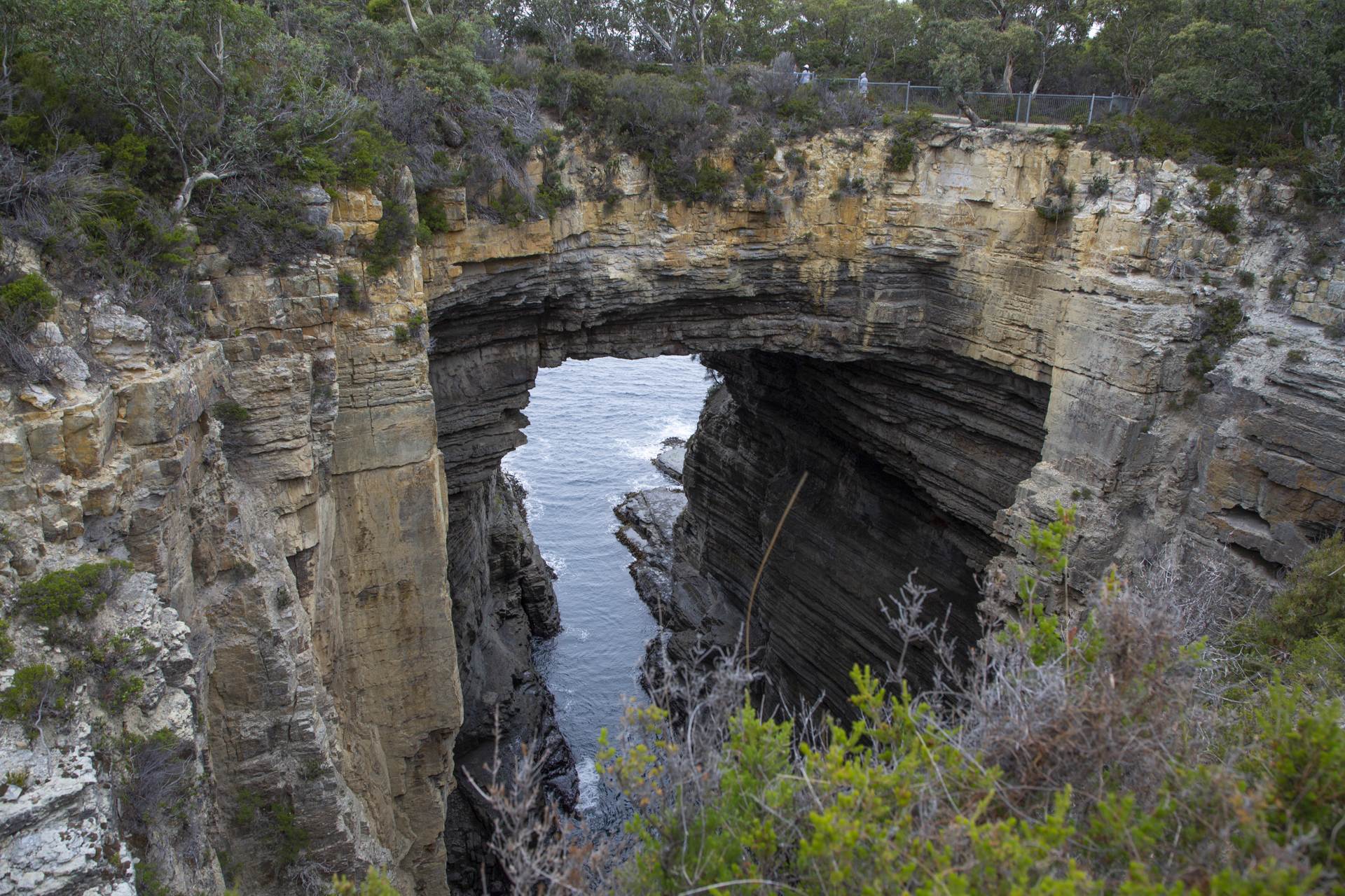 Auf dem Rückweg nach Hobart hielten wir nochmal an einem Aussichtspunkt auf der anderen Seite der Pirates Bay. Der Tasman Arch und die Devils Kitchen sind zwei erodierte enge Einbuchtungen in der Steilküste und nur durch schmale Einschnitte mit malerischen Bögen darüber vom Meer getrennt. Es war gerade Ebbe, so dass man das Schauspiel, wenn das Wasser in die engen Kessel drängt, nicht sehen konnte.