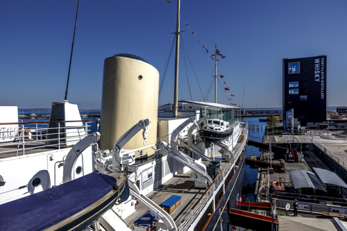 Edinburgh Royal Yacht Britannia Port of Leith Distillery im Hintergrund