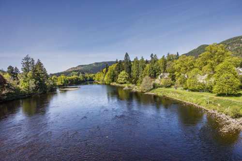 Fluss Tay und die Landschaft am Ufer von der Dunkeld Bridge aus