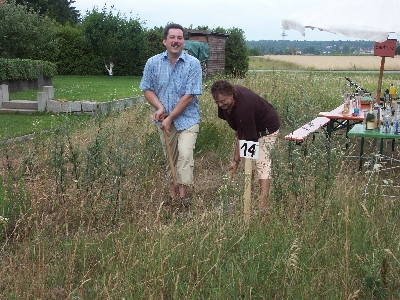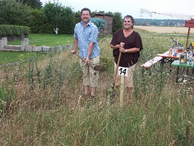 Nach unserem samstäglichen Einkauf lieh ich mir bei Uli eine Sense aus, um zumindest das Unkraut rund um unser jetziges Grundstück zu mähen. Die Spatenstich-Fete dachte ich eigentlich in unserem Hof zu machen.