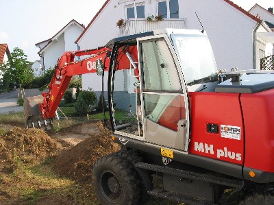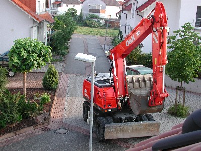 Tatsächlich, am Donnerstag Morgen saß ich zum Frühstück auf der Terrasse, als Fahrzeuggeräusche zu hören waren. Ein Blick um die Mauerecke und wirklich: da stand der Bagger!