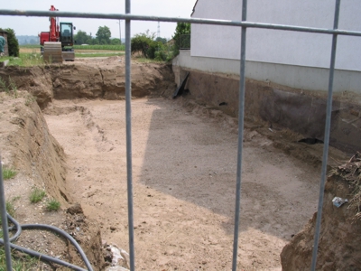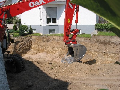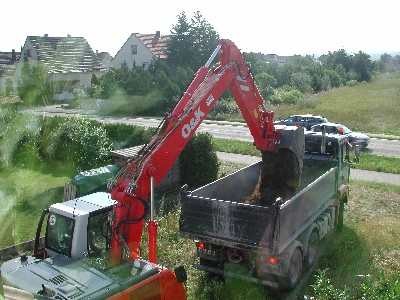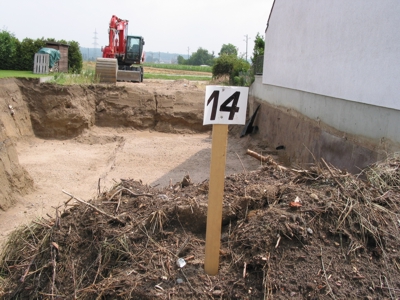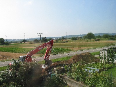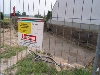 Zwischendurch kam Herr Höfle vorbei, um die Baustelle zu begutachten. Er berichtete uns, daß das Schnurgerüst nun am Montag eingerichtet würde. Bei dem Bauunternehmen fehlte ein wichtiger Mitarbeiter wegen Urlaub. Allerdings sei die Bodenplatte nach wie vor für die Folgewoche geplant.