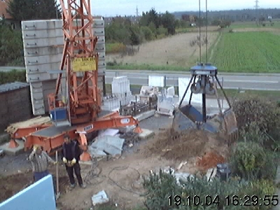 | Mit einem Greifer wird hier entweder angefüllt, oder aber ausgegraben, um Platz für die noch fehlende Wand des Terrassenunterbaus zu schaffen |