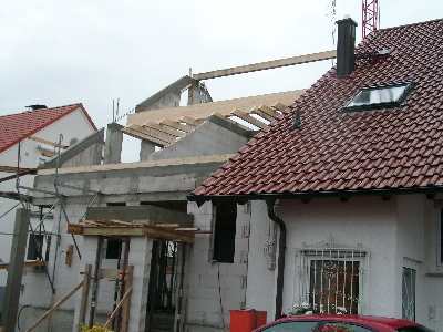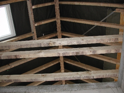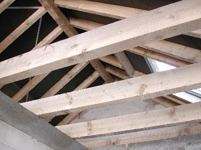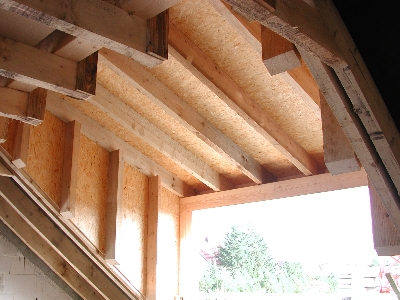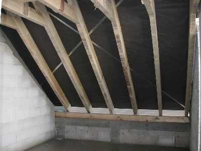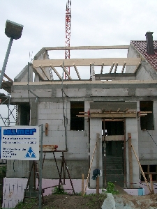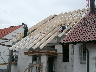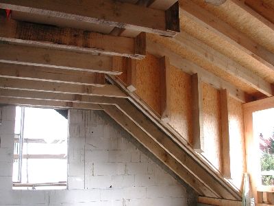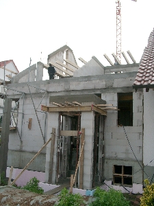 Parallel dazu waren die Bauarbeiter mit verschiedenen Arbeiten zugange. Auf der Webcam war nicht klar zu erkennen, was da getan wurde. Auch nach meiner Rückkehr wurde das noch nicht klar, weil es bereits dunkel war. Montags mußte ich dann schon wieder weg. So konnte ich erst am Donnerstag sehen, was (außer dem Dachstuhl) so alles passiert war. Morgens hatte ich ein Treffen mit Herrn Höfle, weil es nun auch galt, die Dachziegeln vom Speicher zu holen, mit der die Ortgangziegeln ersetzt werden müssen. Da die Dachdecker auf einer anderen Baustelle fest hingen, entriegelte ich wenigstens das Dachfenster, so konnten die Ziegeln von außen entnommen werden.