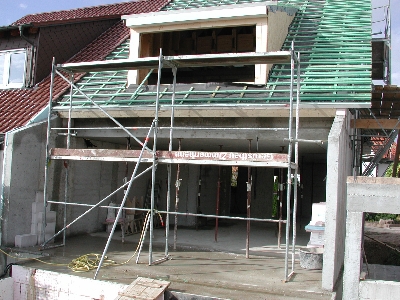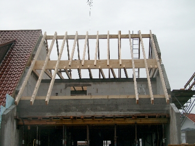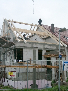 Am Mittwoch war es dann soweit: der Dachstuhl wurde aufgeschlagen. Zum Glück war Renate Richter so nett, diesen Meilenstein im Bild festzuhalten.