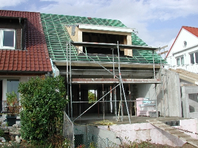 | Gartenseite. Die Folie und die Dachlatten sind auf dem Dach und die Gaube ist auch schon fertig | |