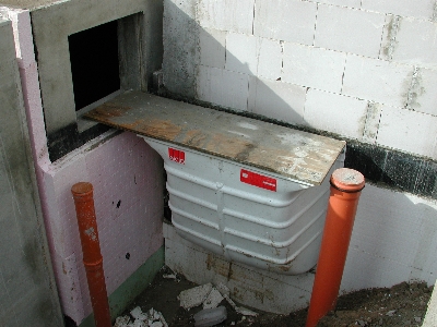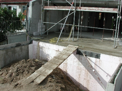 | Lichtschacht am Fenster des Garagenkellers. Rechts das Rohr für die spätere Brunnenbohrung | Jetzt stehen beide Wände, die die Terrassenplatte tragen werden |