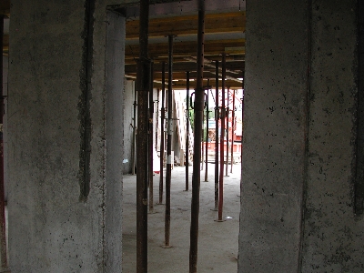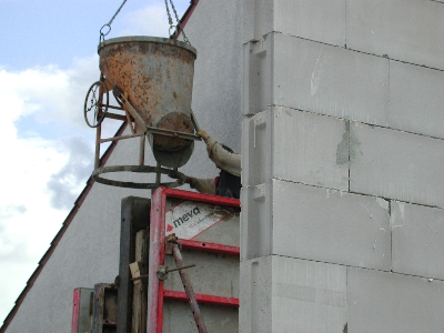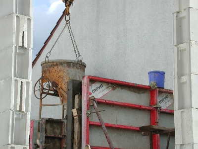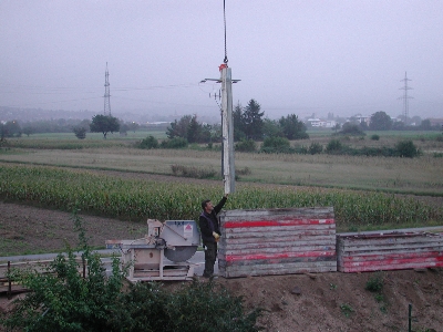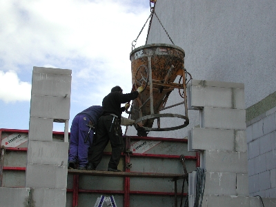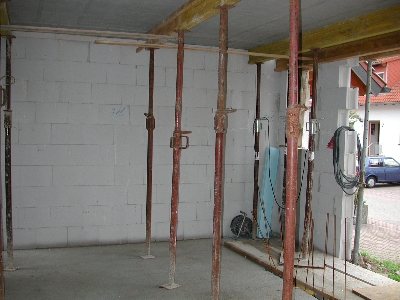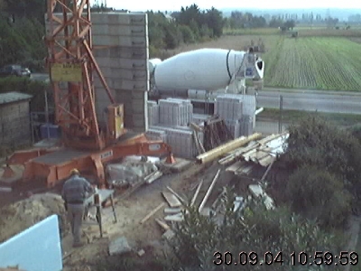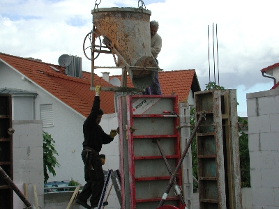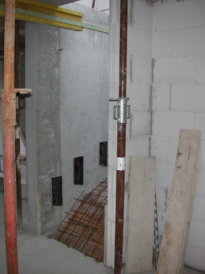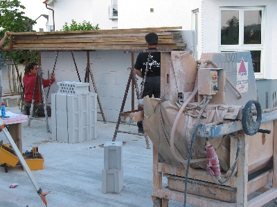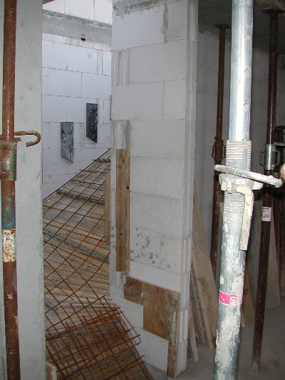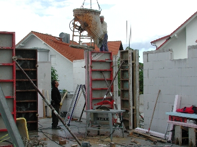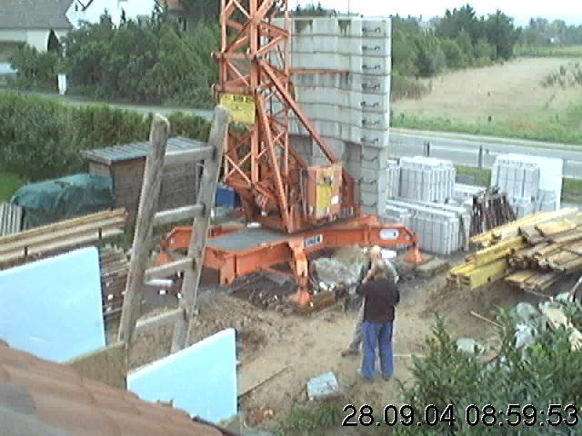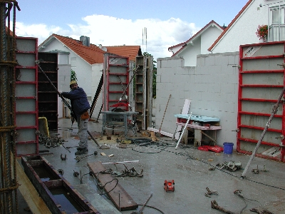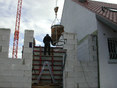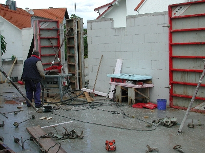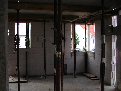 Bei einem Inspektionsgang am Samstag stellte ich fest, daß im Erdgeschoß die Trennwand zum Treppenhaus gemauert war. Allerdings befand sich am Ende der Treppe eine raumhohe Mauer, die da nicht sein sollte. In den Werkplänen war mal als Abschluß der Treppe zum Obergeschoß eine Mauer in Brüstungshöhe vorgesehen, die wir aber eigentlich auch nicht haben wollten. Herr Höfle, den ich am Nachmittag anrief, meinte, daß die raumhohe Mauer so natürlich nicht vorgesehen war. Wie man den Treppenabschluß sonst gestalten könnte, wollten wir uns dann in der Folgewoche ansehen. Die Mauer wird jedenfalls erst mal wieder weg müssen.