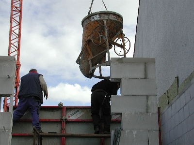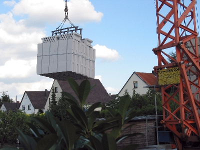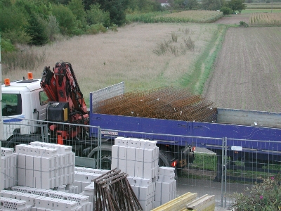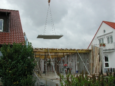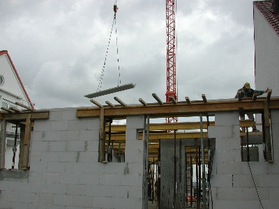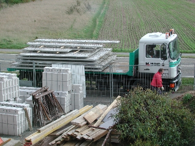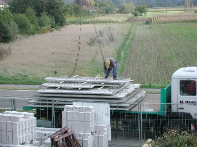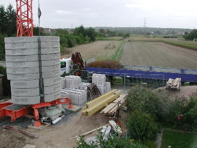 | Die Betonfertigteile für die Decke über dem Erdgeschoß werden angeliefert | |