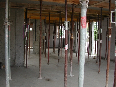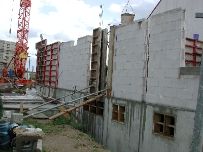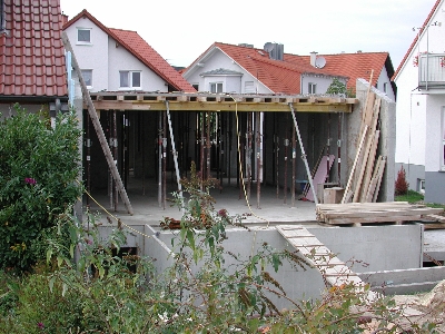 Als wir am Freitag morgen zur Arbeit fuhren, waren die Arbeiter wieder mit der Verschalung beschäftigt. Am Abend waren wir dann allerdings überrascht, daß es sich offensichtlich bereits um das Ausschalen handelte. Die Decke war wohl bereits am Donnerstag gegossen worden. Auch die Außenabdichtung des Kellers war fertig gestellt.