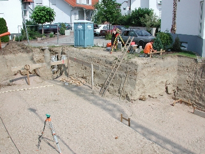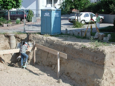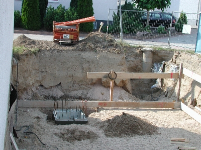 Am Nachmittag schließlich wurde in Zusammenarbeit mit Herrn Höfle, der vor seinem Kurzurlaub nochmals auf der Baustelle erschien, der Schacht für die Hebeanlage eingemessen und eingegraben.