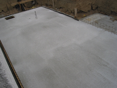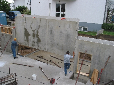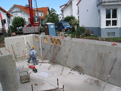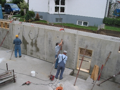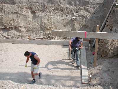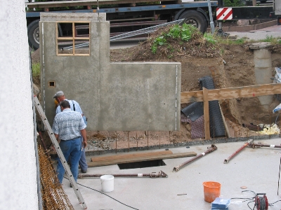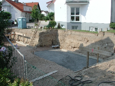 Am Freitag morgen konnten wir dann noch den Bautrupp bei der Vorbereitung für die eigentliche Bodenplatte des Garagenkellers beobachten. Bevor wir zu unserem Kurzurlaub nach München aufbrachen, sprachen wir noch mit dem Capo des Trupps. Er meinte, daß an diesem Freitag noch die Bodenplatte für den Garagenkeller gemacht würde und dann nächste Woche die große Platte.