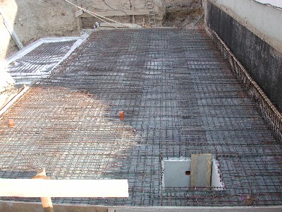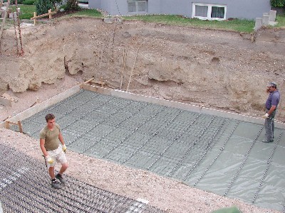 Als wir am Sonntagabend zurück kamen, hatte sich allerdings weit mehr getan. Nicht nur die Sauberkeitsschicht der eigentlichen Bodenplatte war aufgebracht, sondern auch die komplette Armierung. Unsere Nachbarn erzählten uns, daß am Samstag 6-8 Mann von 7:00 bis 17:00 Uhr gearbeitet hätten.