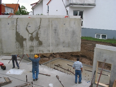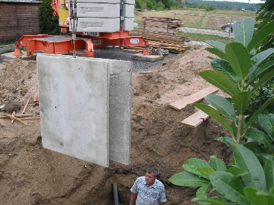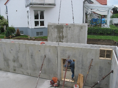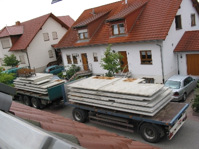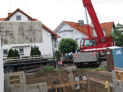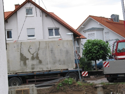 Dann passierte erst mal wieder eine Woche nichts. Am Donnerstag den 19. August war dann der Termin für die Anlieferung der Kellerwandelemente. Ich war zwar inzwischen aus China zurück, allerdings schon wieder unterwegs. Dieses Mal in Oberkirch. Johanna hatte zum Glück frei und konnte das Geschehen dokumentieren.