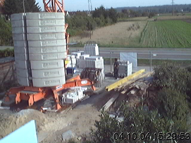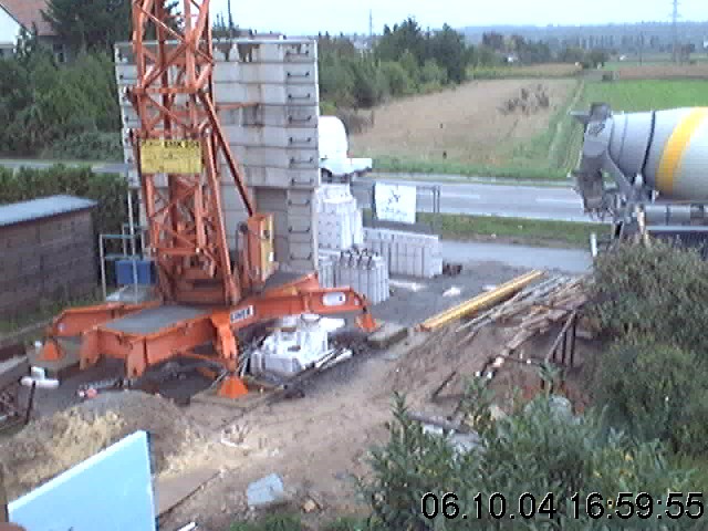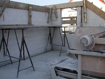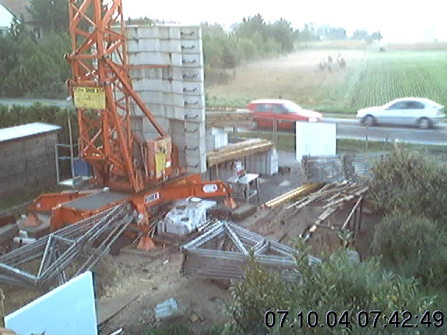 Der Aufbau des Dachgestühls war eigentlich für Dienstag geplant. Da die Laufkatze des Krans allerdings beschädigt ist und erst ein Ersatzteil beschafft werden muß, verschiebt sich dieser Bauabschnitt auf Mittwoch.