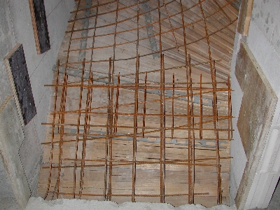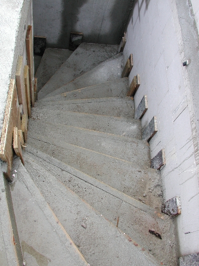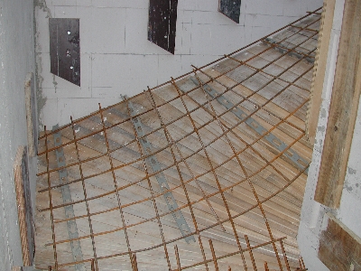 Die Treppe ins Obergeschoß wurde eingeschalt und gegossen. Die Verschalung für den Unterbau der Treppe war ein handwerkliches Meisterstück aus fächerförmig geschnittenen Holzbrettern.