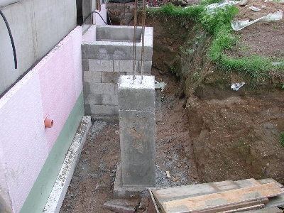 Im Bereich vorm Haus wurde der Unterbau für den Hauseingangserker gemauert und betoniert. Der Sockel für die Säule, die das Vordach abstürzen wird, ist allerdings etwas schief geraten. Na ja, das verschwindet ja eh unter der Erde.