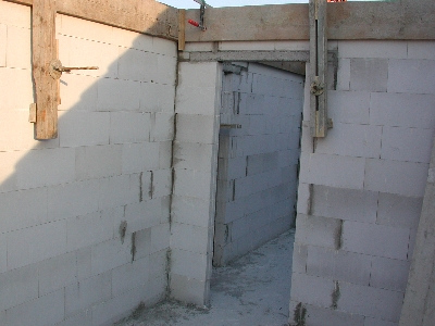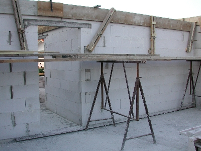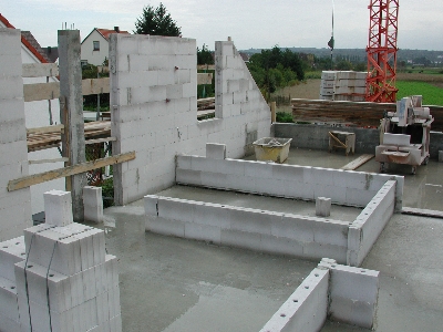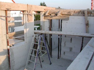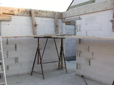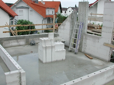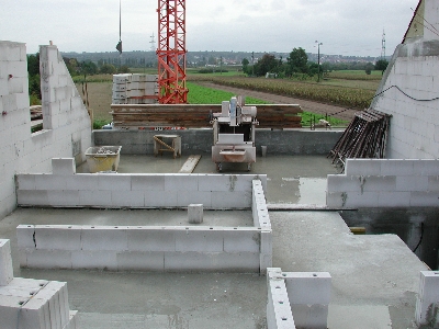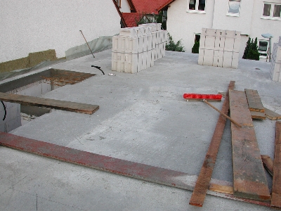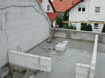 Als ich am Dienstag abends von unserem Abteilungsausflug zurück kam, war die Eingangstreppe eingeschalt und die Wände im Obergeschoß soweit fertig gemauert.