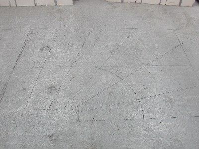 Offensichtlich waren die Arbeiter auch schon mit der Planung der Treppe vom Erdgeschoß beschäftigt. An der Wand des Treppenaufgangs fanden sich ebenso Zeichnungen, wie eine 1:1 Schablone auf dem Boden.