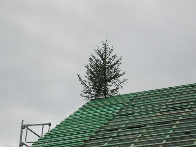 Kurz nach 16:00 stieg dann wiederum Herr Gaag auf's Dach und hielt mit weit schallender Stimme die Ansprache. Das Glas Sekt, zerschmetterte im Bereich der Garage, da ja das Dach selbst bereits mit Folie verschlossen war.