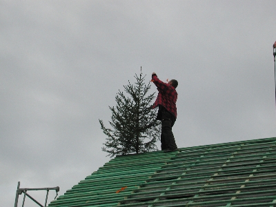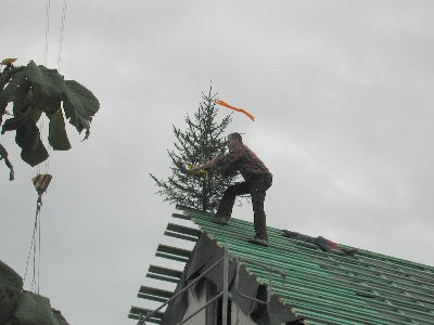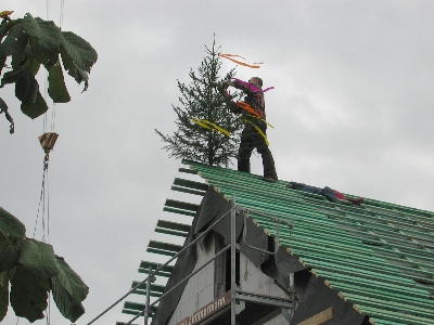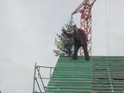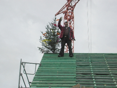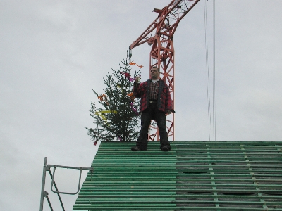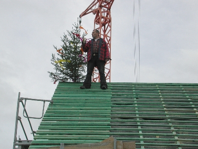 Herr Gaag, der Zimmermann befestigte noch die Richtkrone auf dem Dach.
